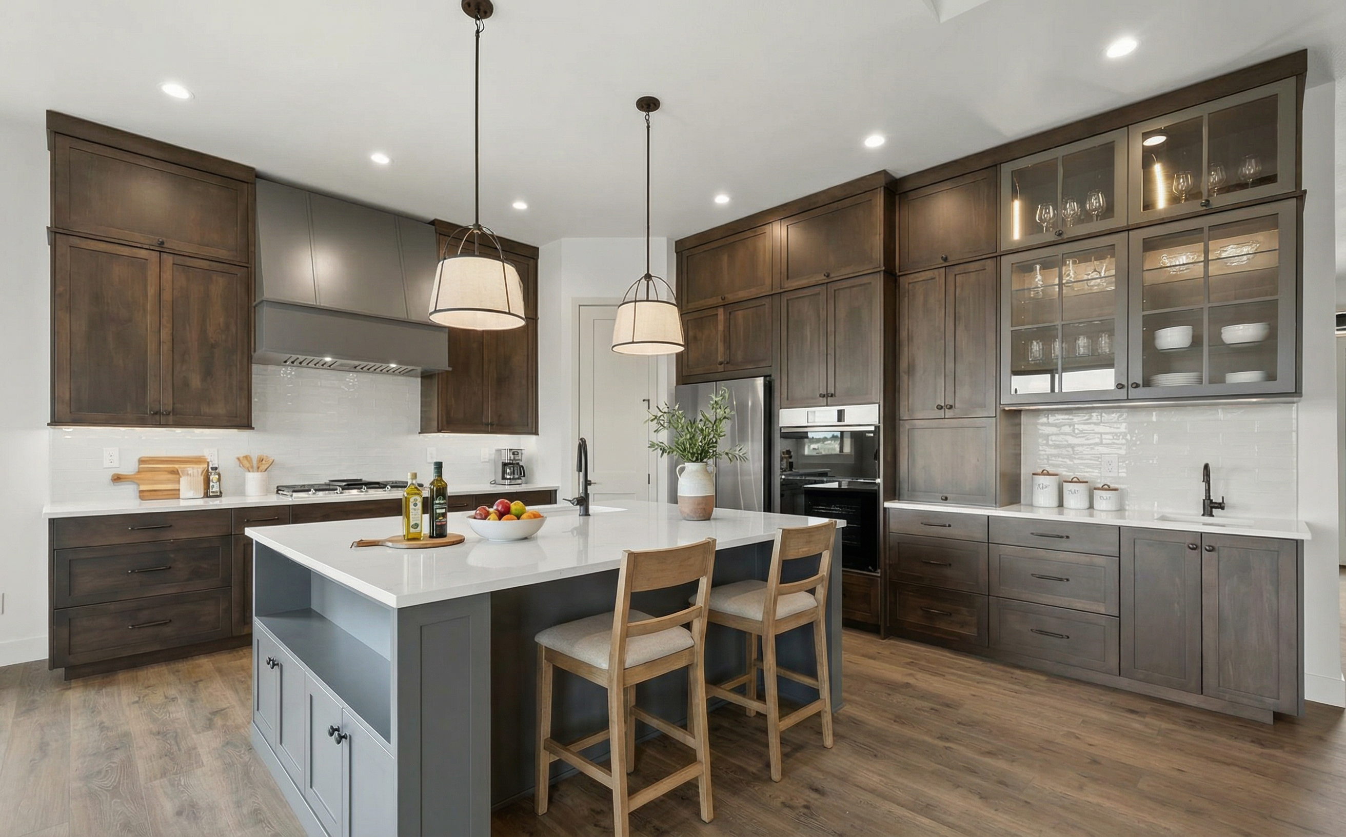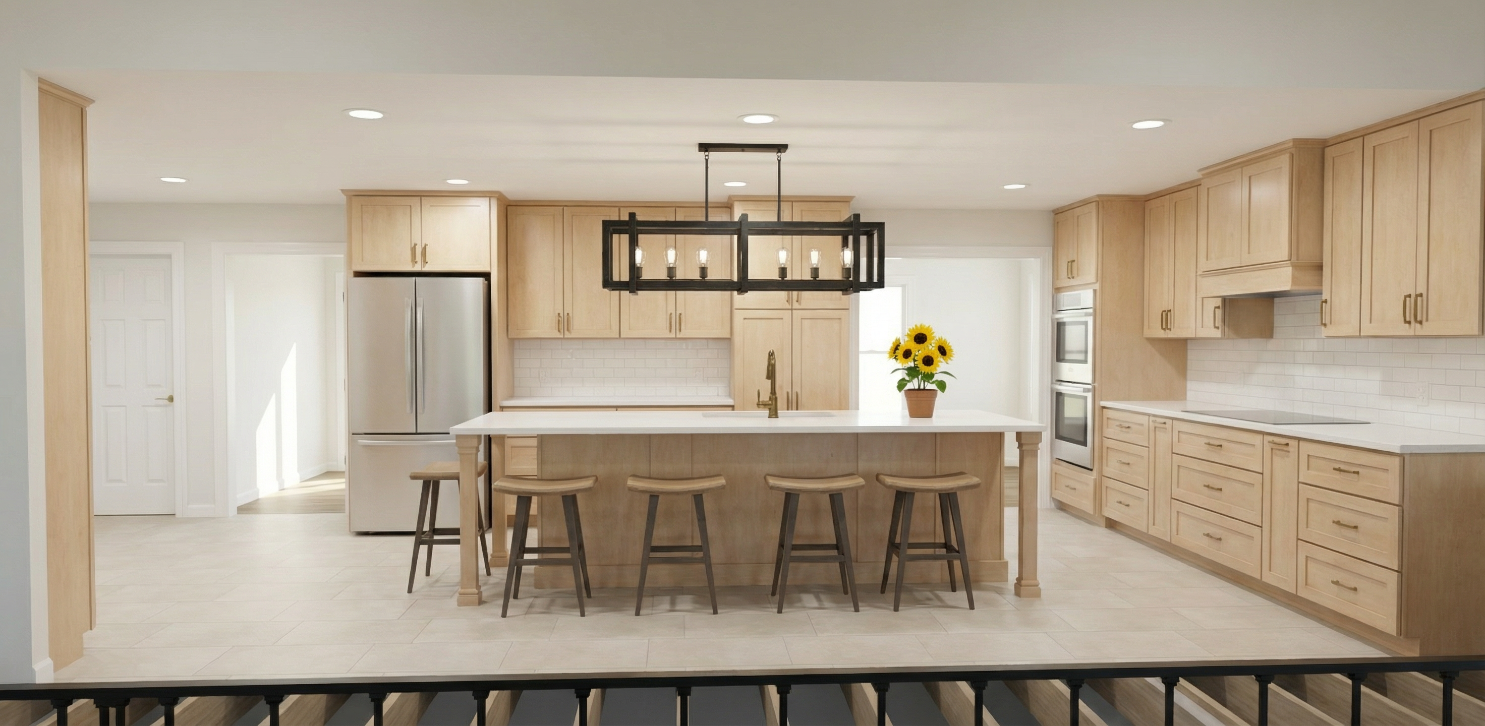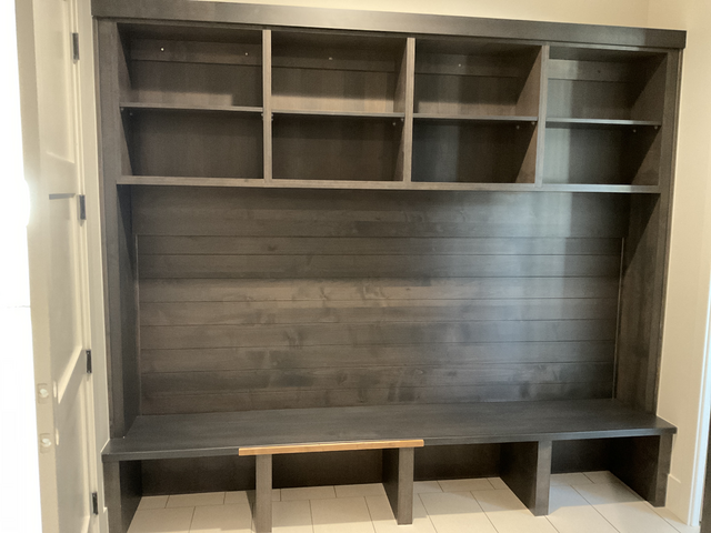 do not change the cabinets in any way preserve the exact cabinet colors materials finishes dimensions door and drawer styles hardware spacing alignment and all geometry exactly as shown do not alter the countertop shape backsplash appliances flooring lighting fixtures or wall structure only remove the construction materials clutter and mess from the scene clean the room and make it look finished and staged add a few simple tasteful home accessories appropriate for the style of the space but do not add or remove any furniture windows or architectural elements maintain the original lighting direction and realism enhance clarity and polish the photo while keeping the cabinetry and room design completely unchanged do not alter the lighting to keep the cabinet colors as they are in the image stage for a mudroom bench