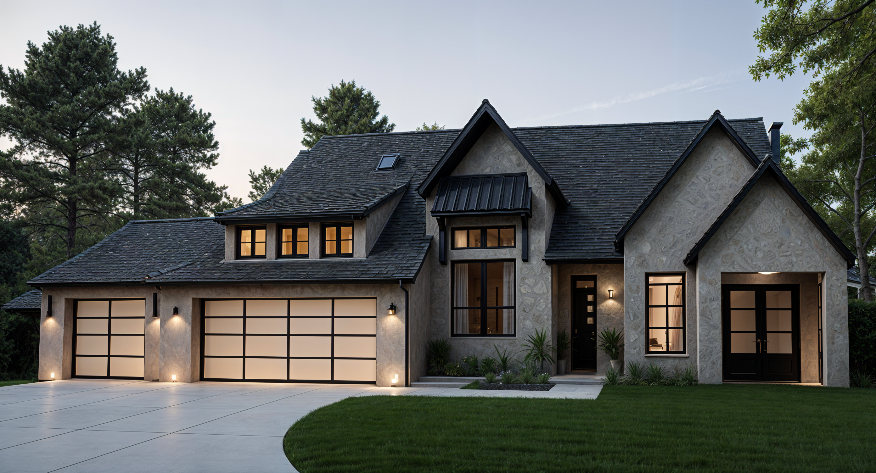 modernist exterior shot brick and stone home with black asphalt roof and lighting inside the home the double doors on the right are the entry doors remove the current door in the middle add a concrete drive in front of both of the garages architecture
