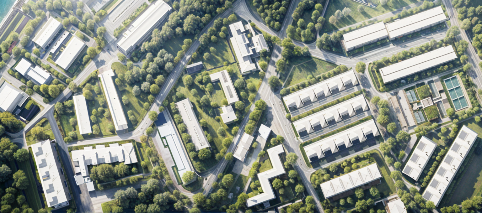 create a clean architectural site plan presentation keep all geometry shapes and outlines exactly as in the input style dry minimal collage look no watercolor effect no soft painting textures subtle flat textures only slightly grainy muted tones sand olive grey low contrast no dramatic shadows bright even lighting landscaping flat controlled grass texture no 3d volume greenery shown as simple graphic patches very light uniform color variation no bush shapes no soft brushes no painterly strokes water soft turquoise fill smooth flat surface no reflections materials very subtle pavement texture everything clean graphic and light do not change any geometry or linework only apply minimal realistic textures in a dry collage style