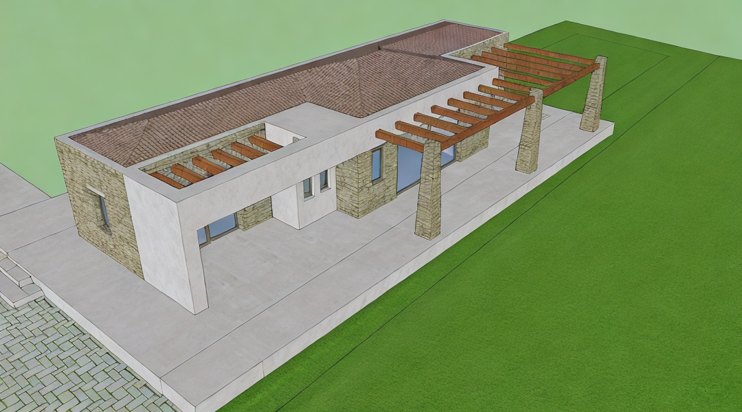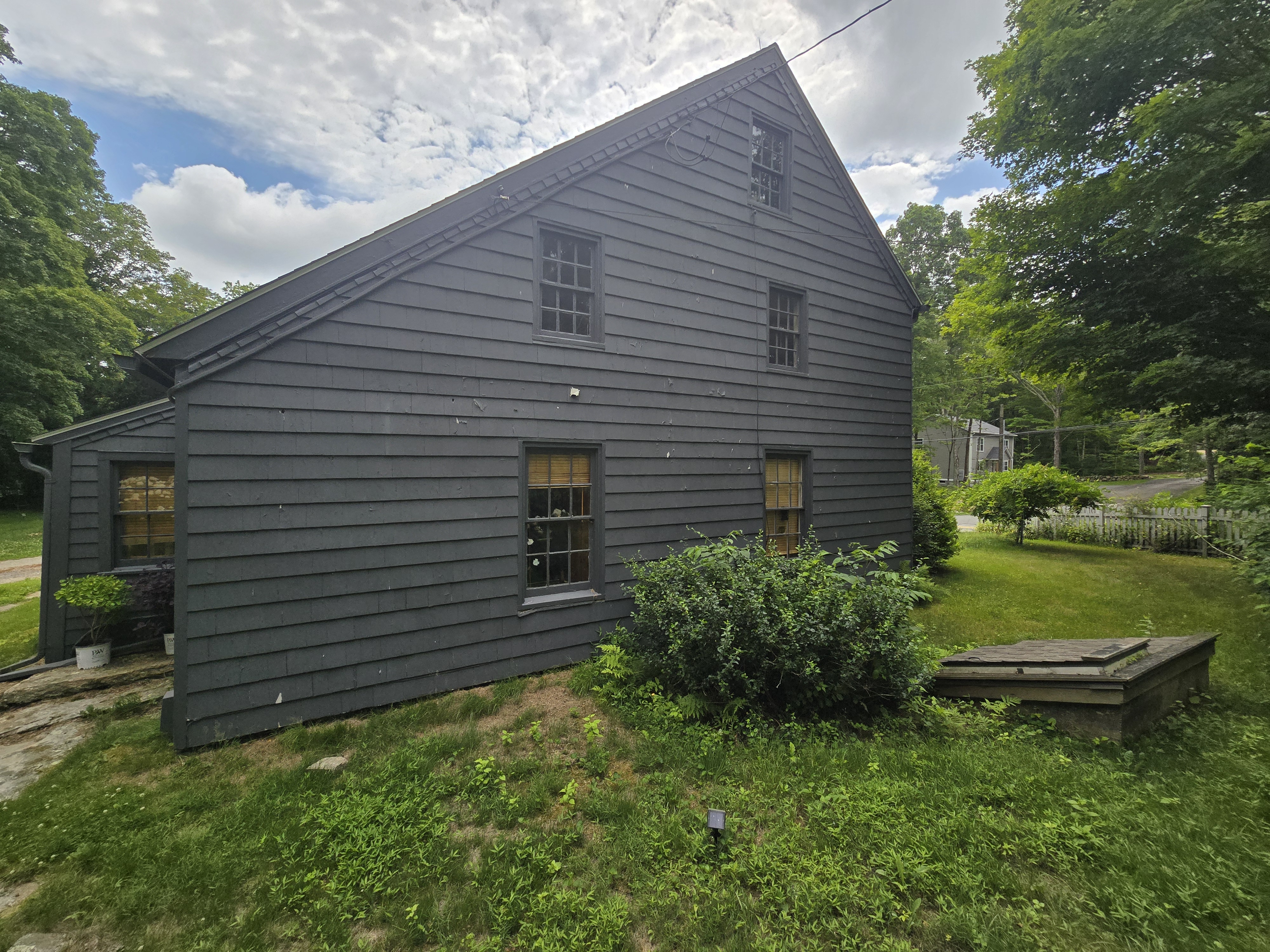exterior shot render a scene in new england with matching siding and roof color and style as the mood board image make the standing seam metal roof above the patio doors bright copper and the patio be made of natural rock and bluestone add lush foliage and shrubs around yard and a beautiful blue sky on a fall day in new england
