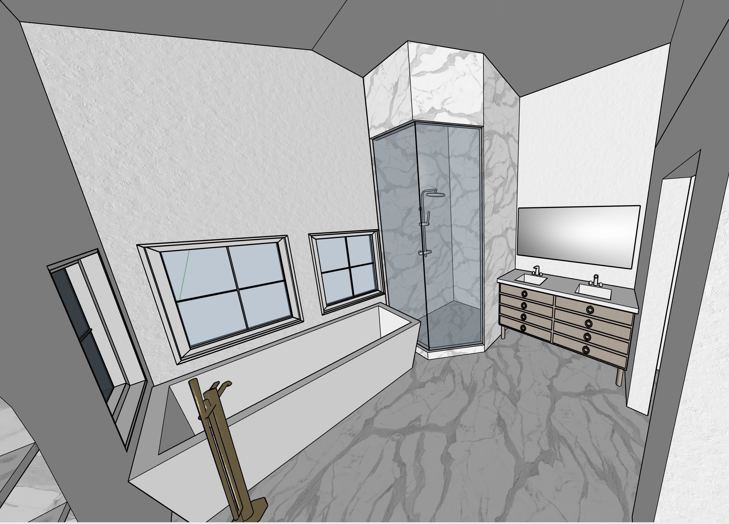 floor is white marble with grey veins walls of shower are white marble with grey veins natural light fills the space