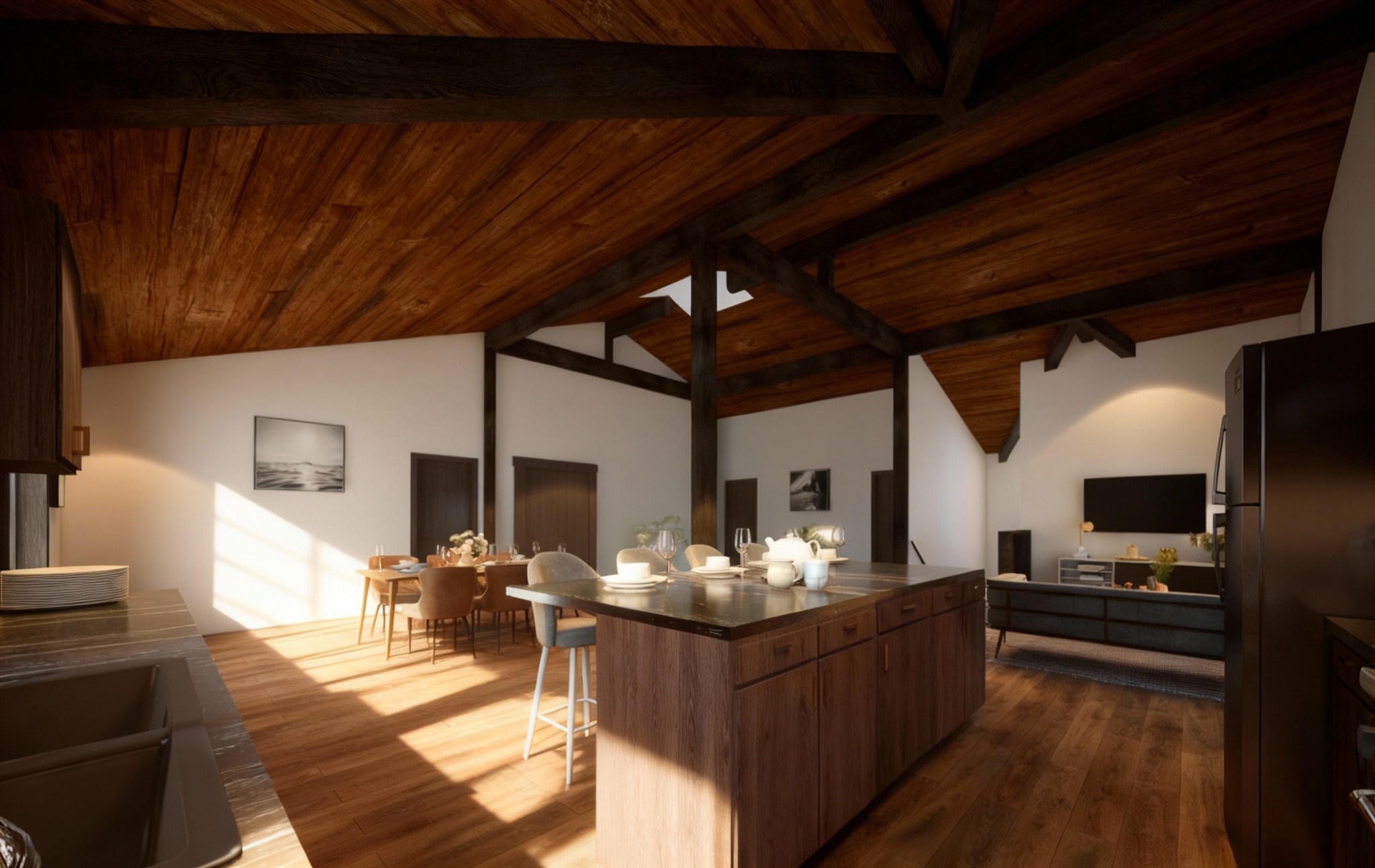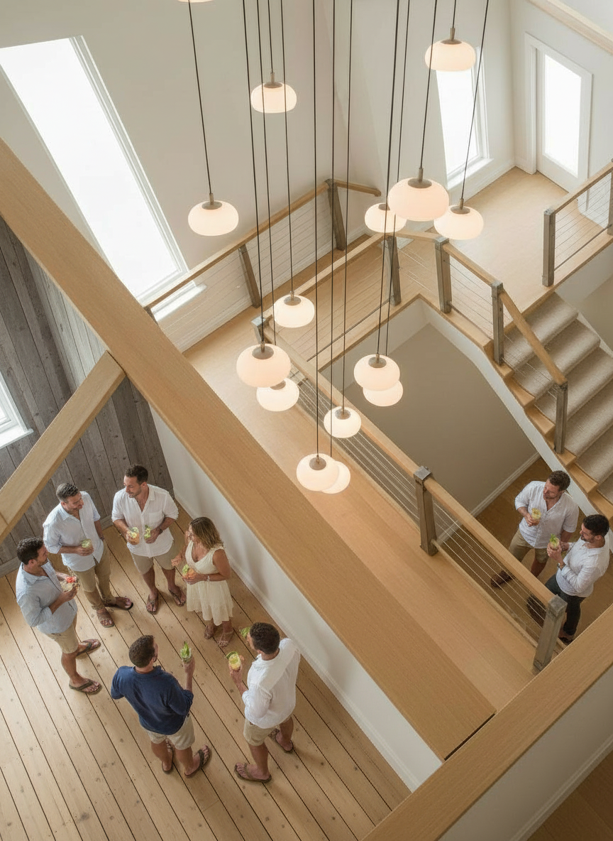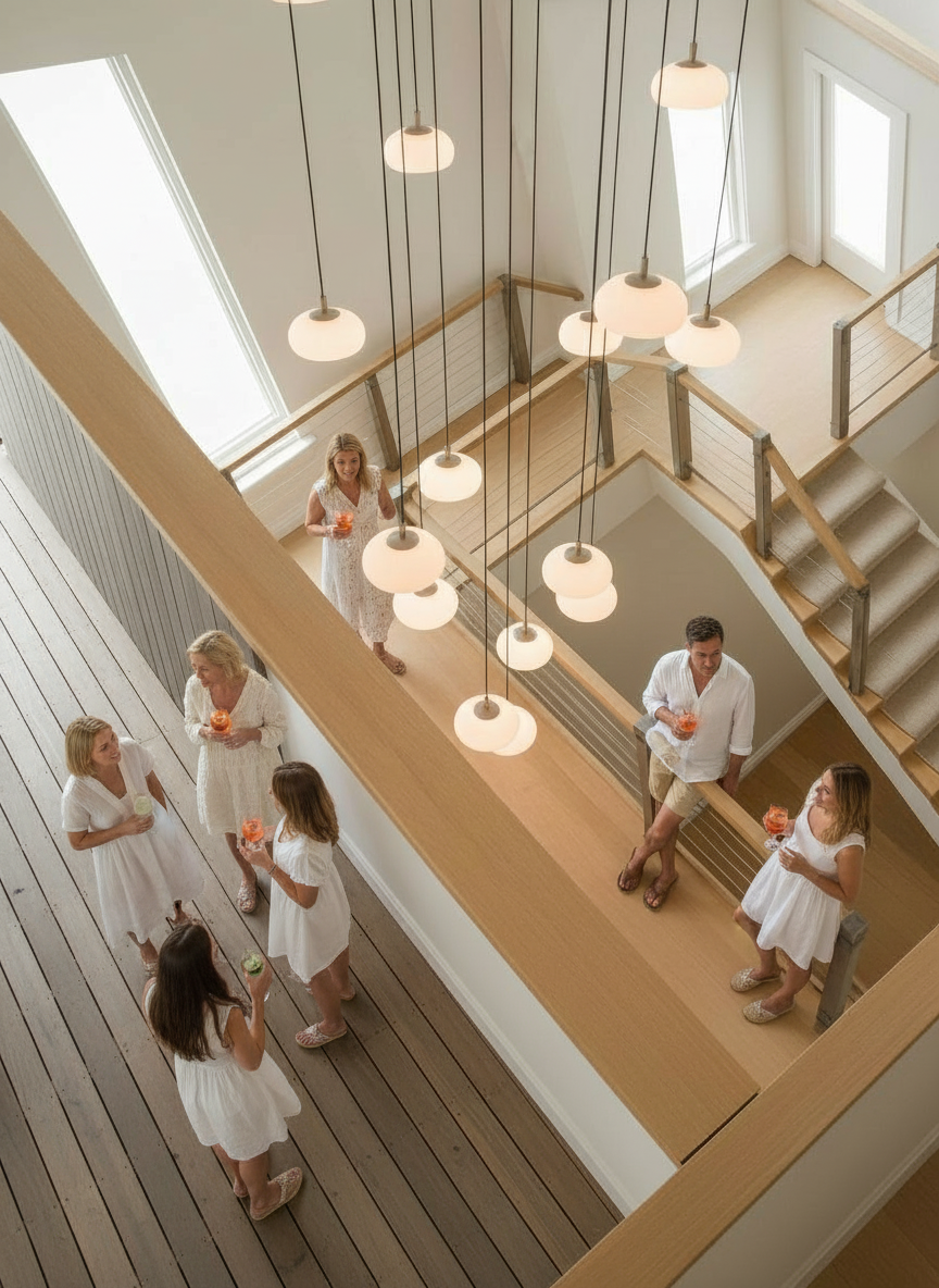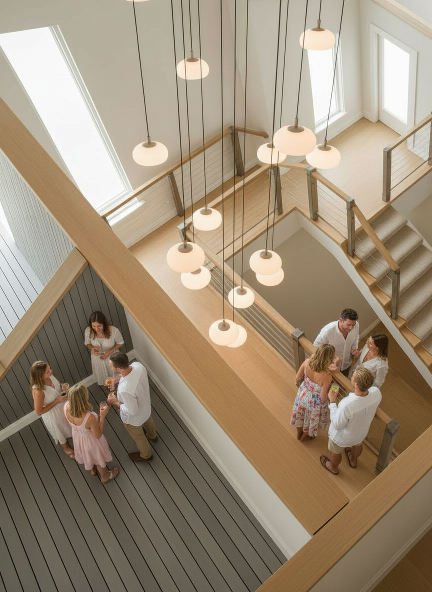 replace flooring on the left with decking add women and men standing in casual summer attire having cocktails scattered around replace white walls to the left with vertical gray boards reduce people