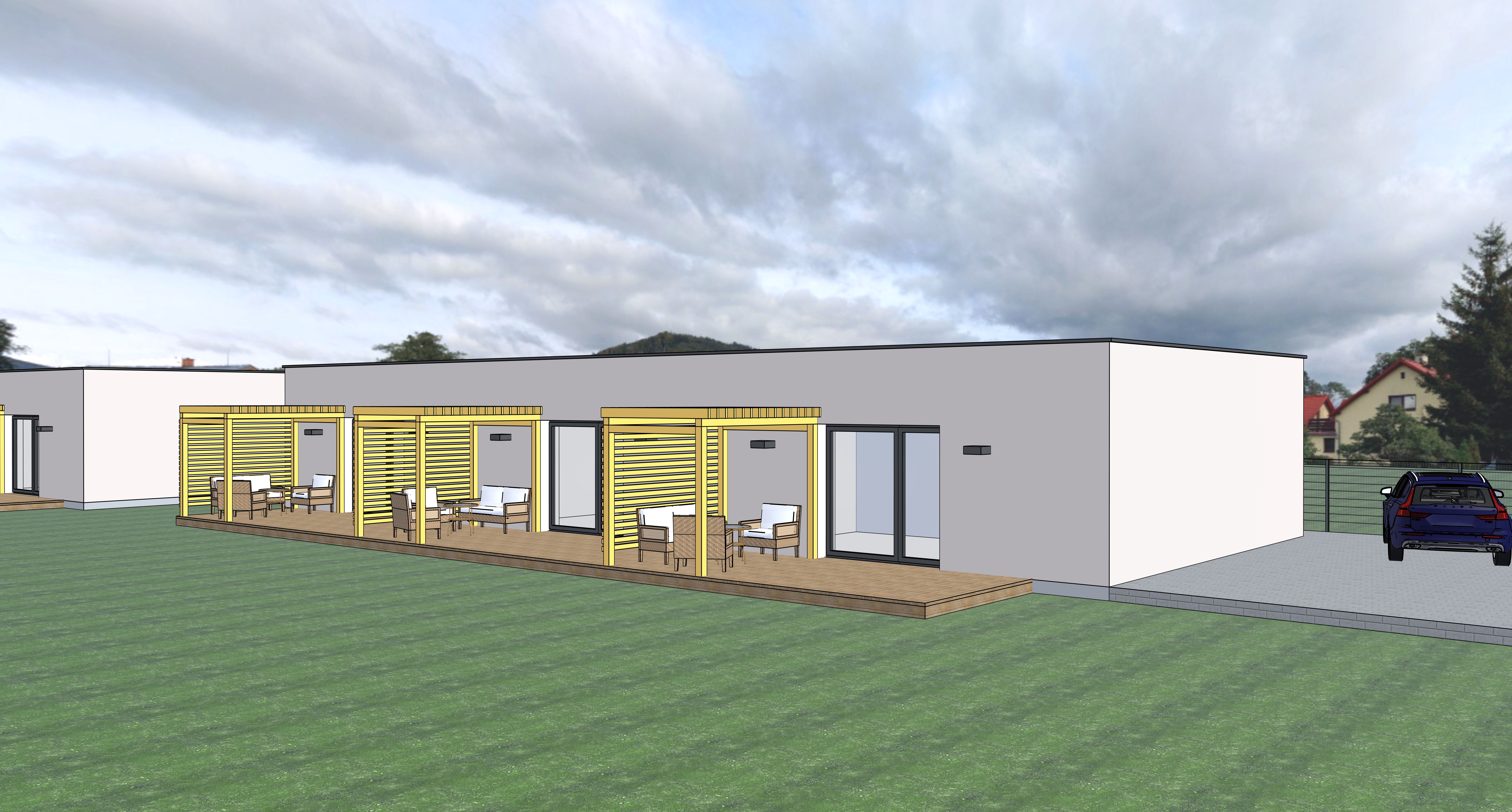 exterior shot d m se t emi byty terasou a pergolami v n vaznosti na n j je vid t je t kousek druh ho domu vstupn obr zek je sketchupov v stup p ekresli hrany do realistick ho vizu lu d ev n prvky pergoly vykresli v dez nu dub p rodn tr va m b t o 1 schod n ne zpevn n plochy prove realisticky