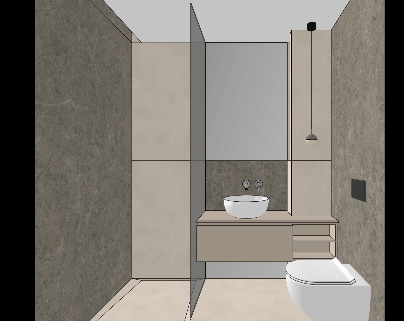 interior shot warm light from trimless spotlight over sink and linear cove led light on left wall