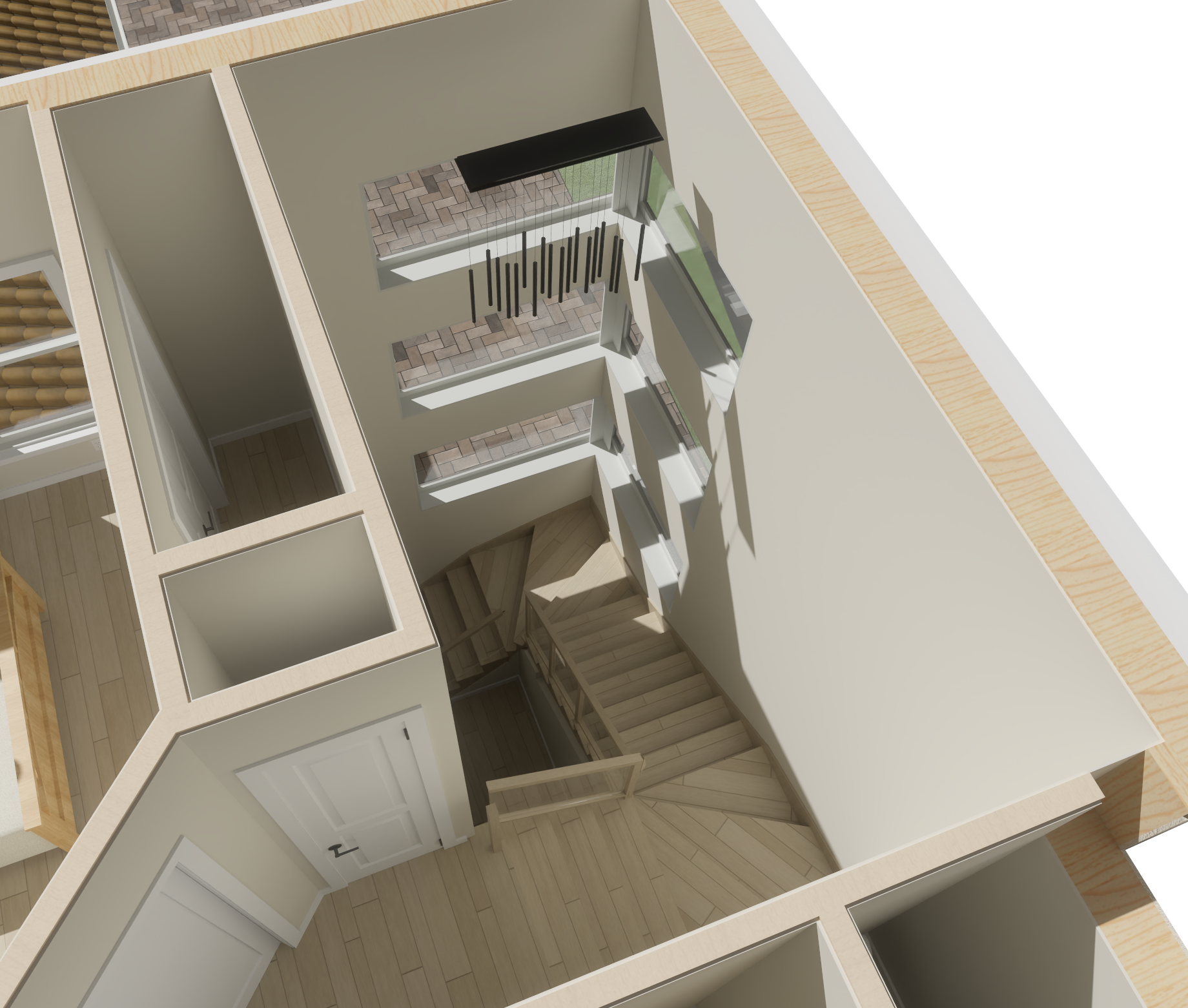 without changing the structure of my first picture change the materials to a cozy modern with glass hand rail with black metal top rail darker flooring