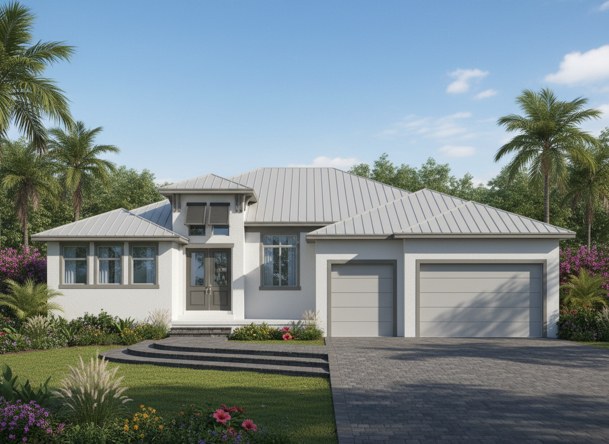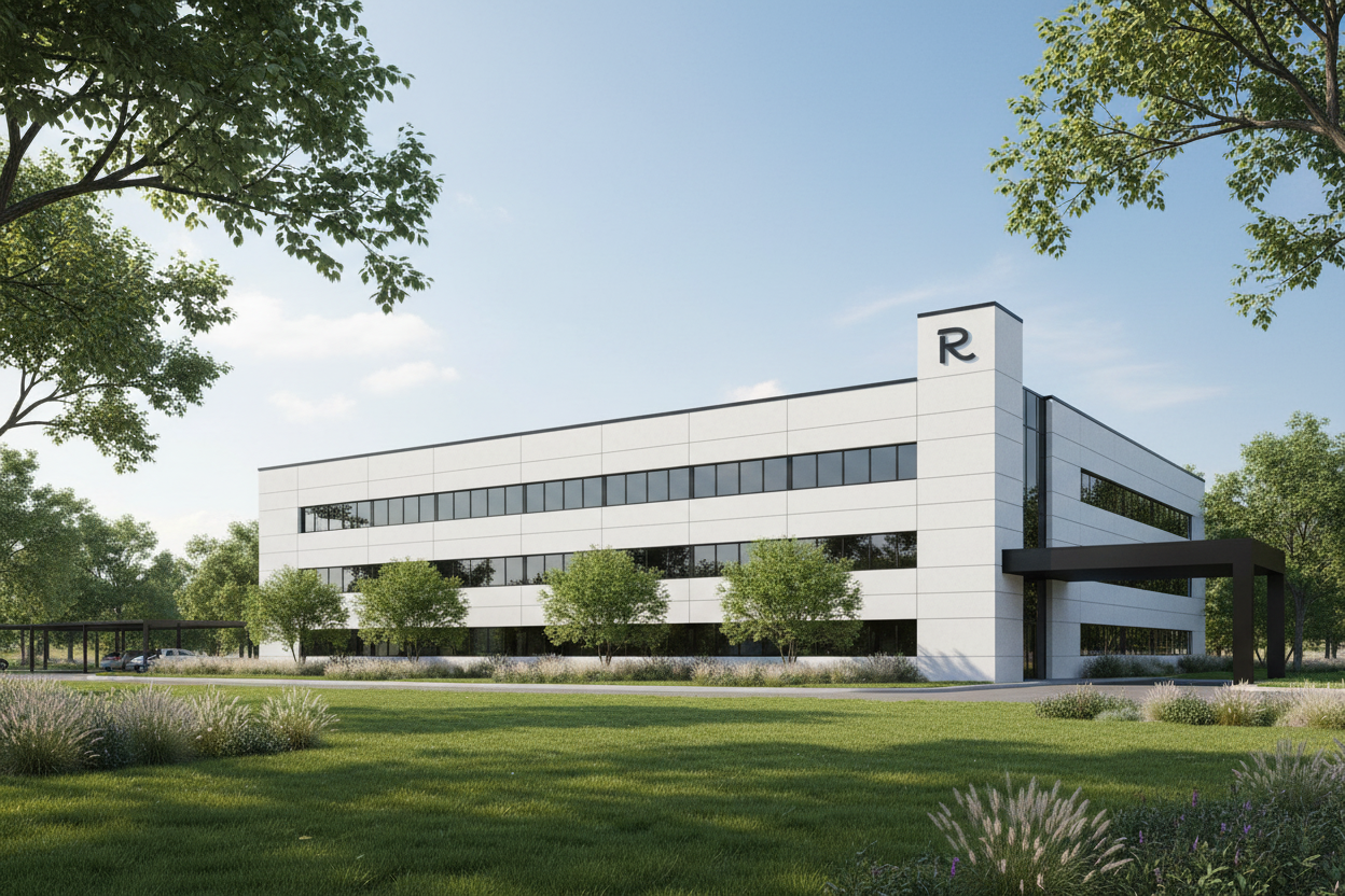 modern office building dark reflective glass dark frames white main body black r logo at tower covered drop off area on the right please do not add any additional trimwork other than small frieze trim along top of the building which should be black all landscaping at front of the building make covered drop off area all black add mature trees show view more towards the right of the building covered parking area should be back from the front wall 30 make tower on the right 22 d eep push covered parking back beyond the tower remove the added third level covered area should not align with the front of the building please push it back behind the corner tower area the building should be twice as deep with all windows like previous rendering