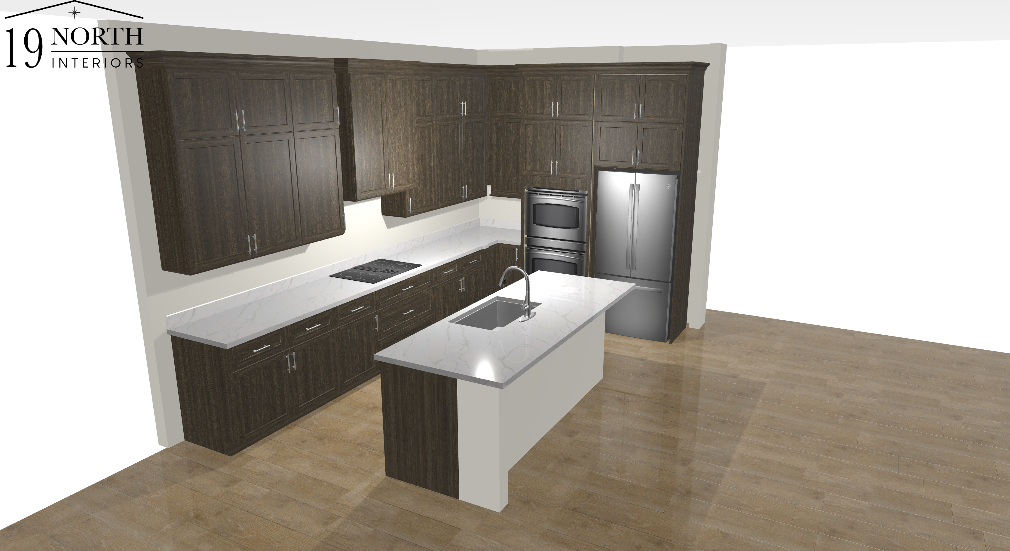 a realistic kitchen rendering of deep espresso cabinets with beautiful quartz counters stainless steel appliances and white walls