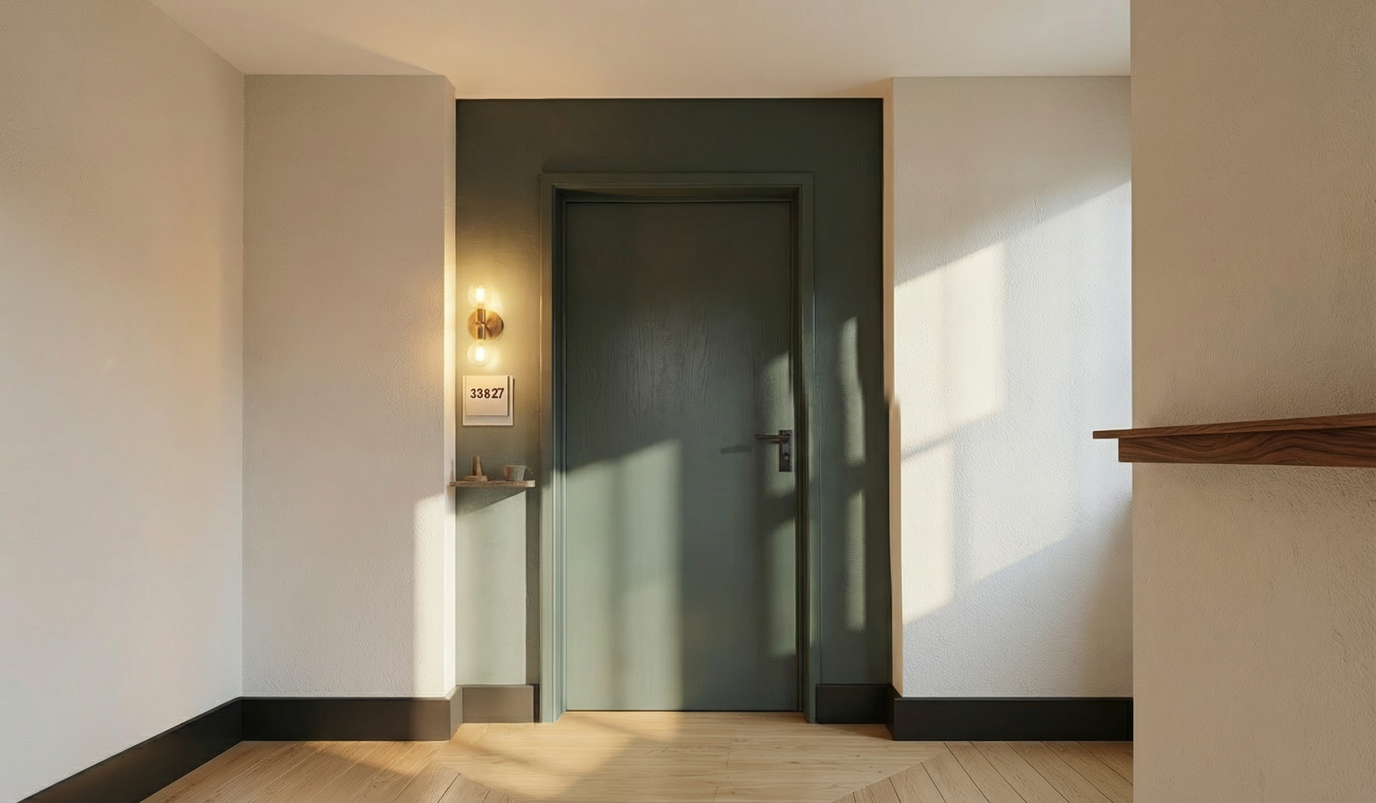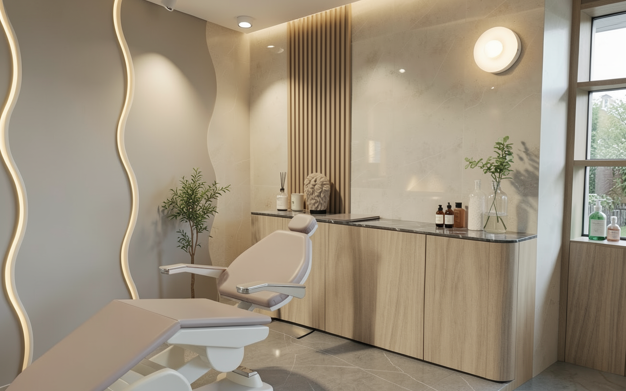 only change the wall behind the reception desk use the reference photo for what the back wall should look like keep everything else exactly like the main image the blue wall hallways reception desk rug sofa coffee tables should all stay