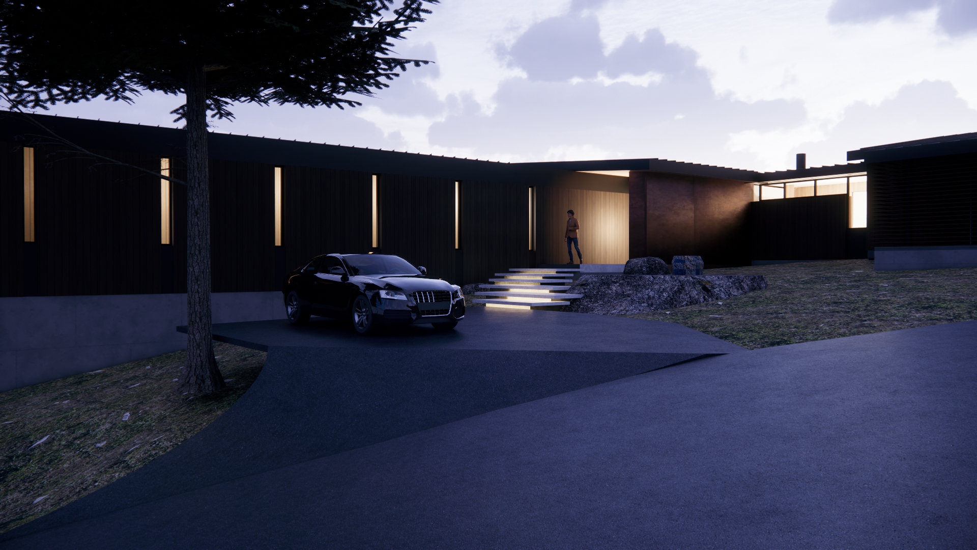 winter scene with snow make entry wall concrete glowing light from interior add granite boulders in landscape and ponderosa pine trees