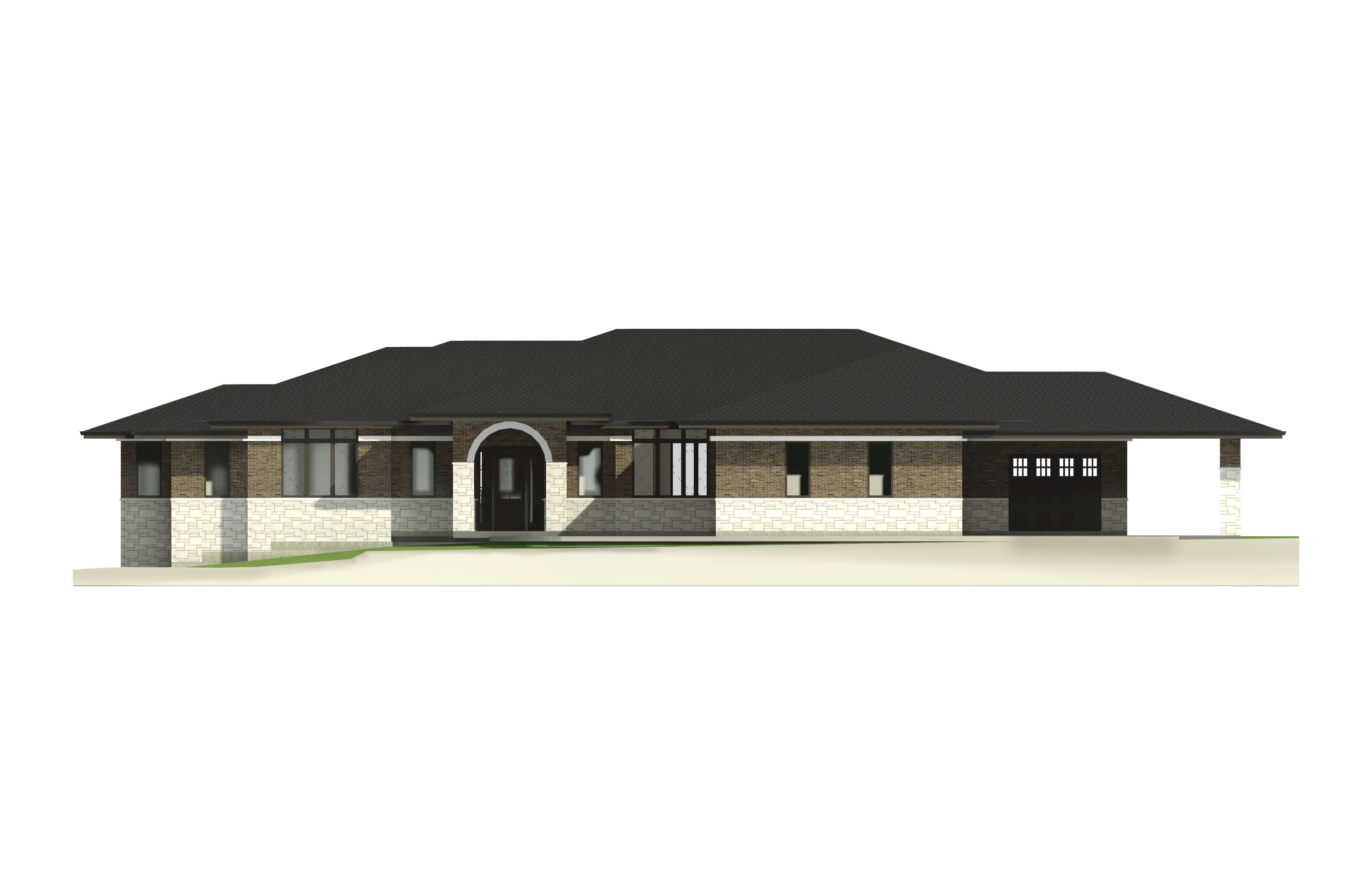 brown espresso brick light natural limestone black window frames black shingles roof black fascia gutters and soffits add driveway on the right add sidewalk from front entry to the driveway on a clear sky spring afternoon make it realistic