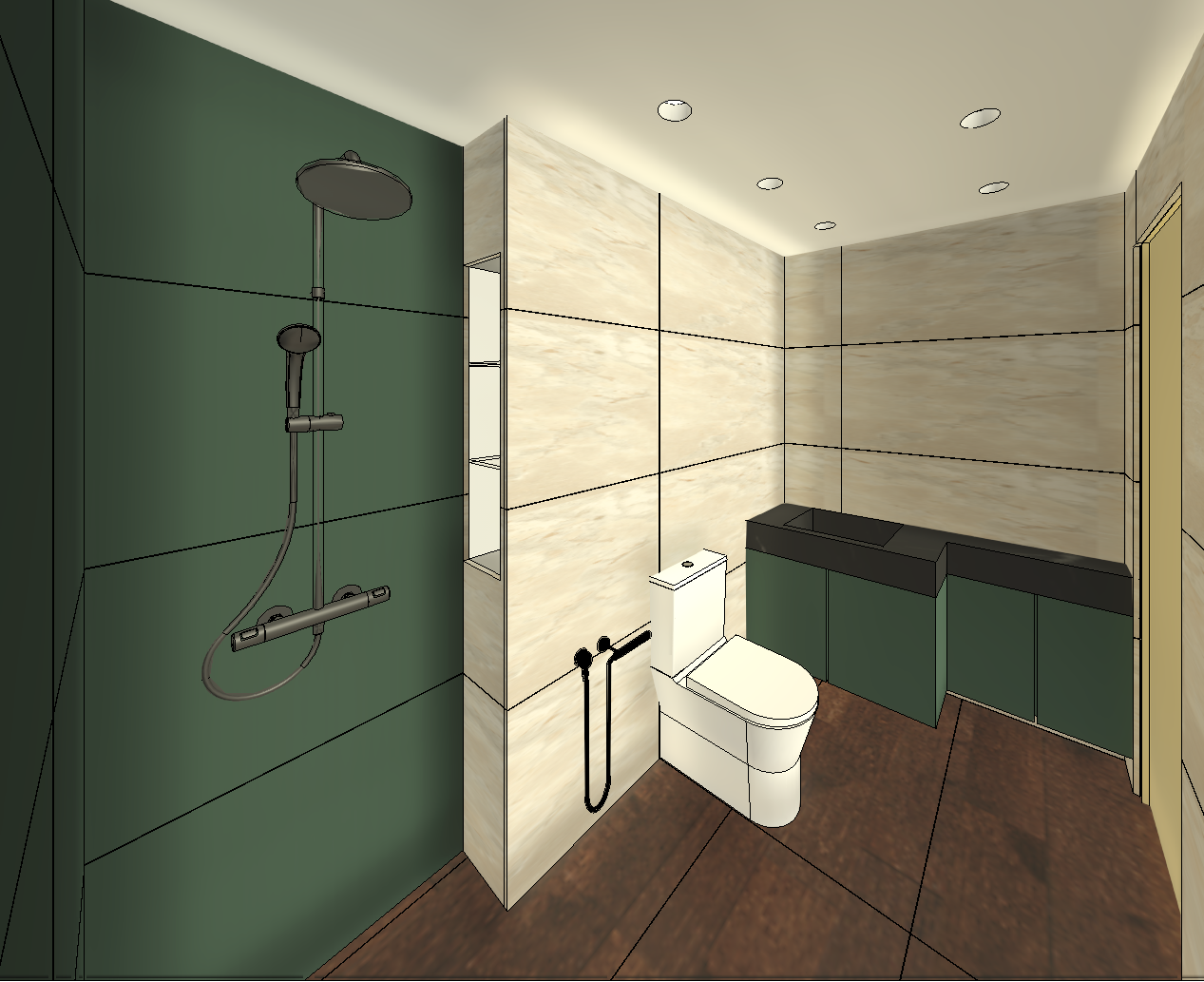 this is a bathroom only artificial light from the roof put led light in the whole next to the white wall the whole room is with polished tiles only the floor is not polished put mirror wit irregular form above the sink the green tile shoul be like mosaic