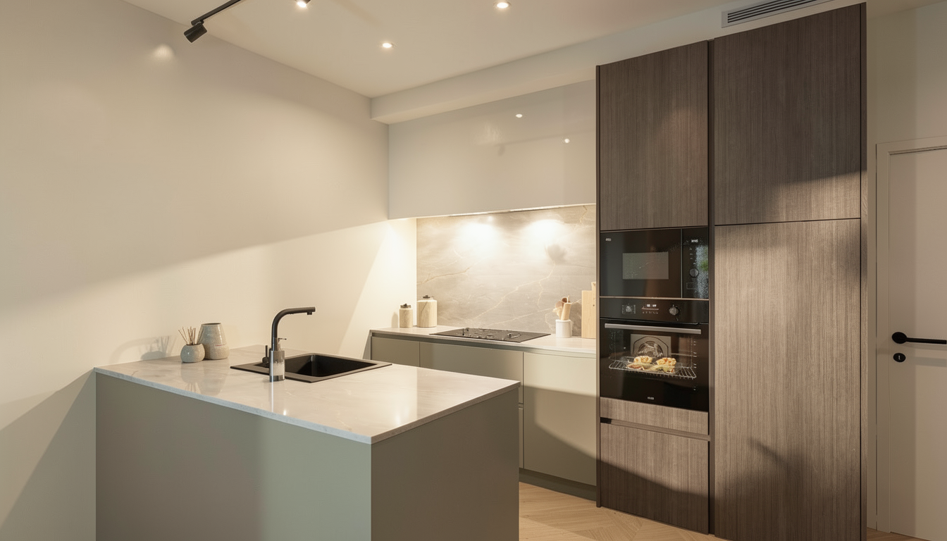 aerial view of a vibrant urban neighborhood in fall featuring a variety of modern and vintage buildings the buildings have white and gray rooftops with reddish brown facades the streets are lined with lush green trees transitioning to autumn hues of orange red and yellow the atmosphere is lively with a clear blue sky enhancing the vividness of the foliage and architecture create a balance of light and shadow to emphasize the texture and depth of the buildings and trees do not change layout do not redesign buildings no new structures no artistic reinterpretation
