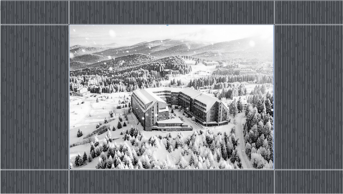 create full height dark walnut wall cladding integrate a large wall artwork depicting the hotel in the winter season lighting should be warm 3000k with soft ambient illumination creating a cozy mountain atmosphere realistic architectural render of the wall accurate material textures natural light bounce soft shadows sharp details correct proportions professional interior visualization beige carpet on the floor gipsum ceilin in white colour