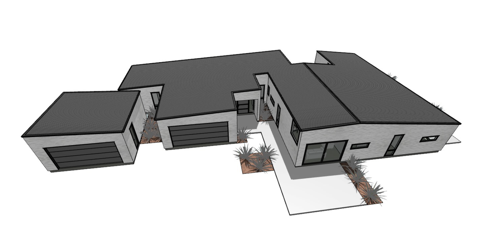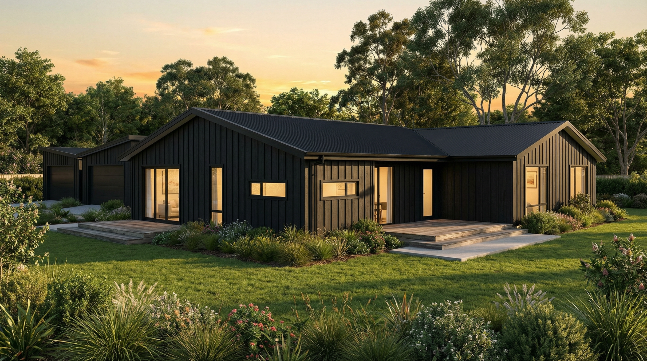 black board and batten cladding black roof black window frames low timber decks lawn extensive native plants trees in background sunset interior lights on