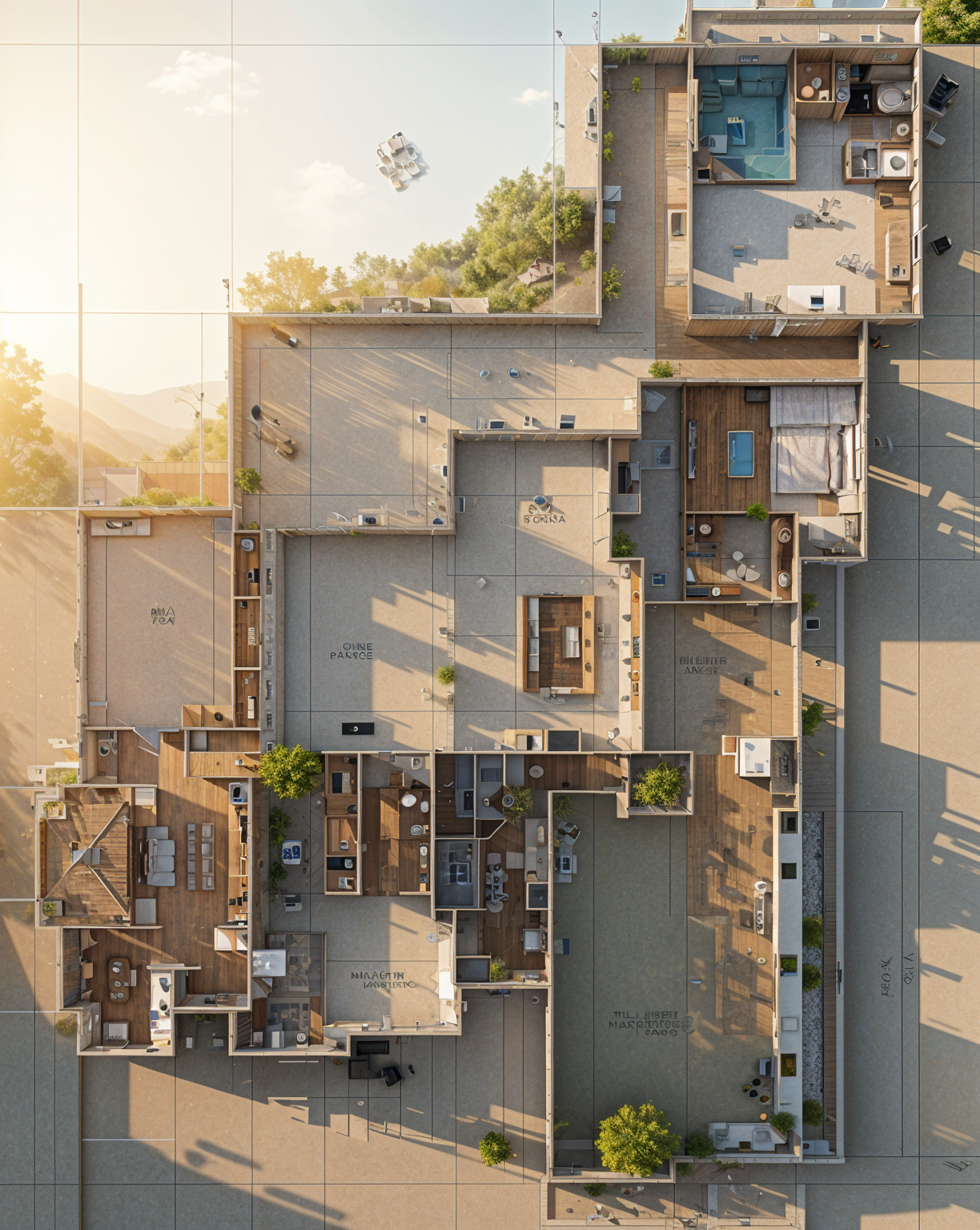 modernist exterior shot keep colors and materials the same put onto gray background this is a football field folded in half architecture