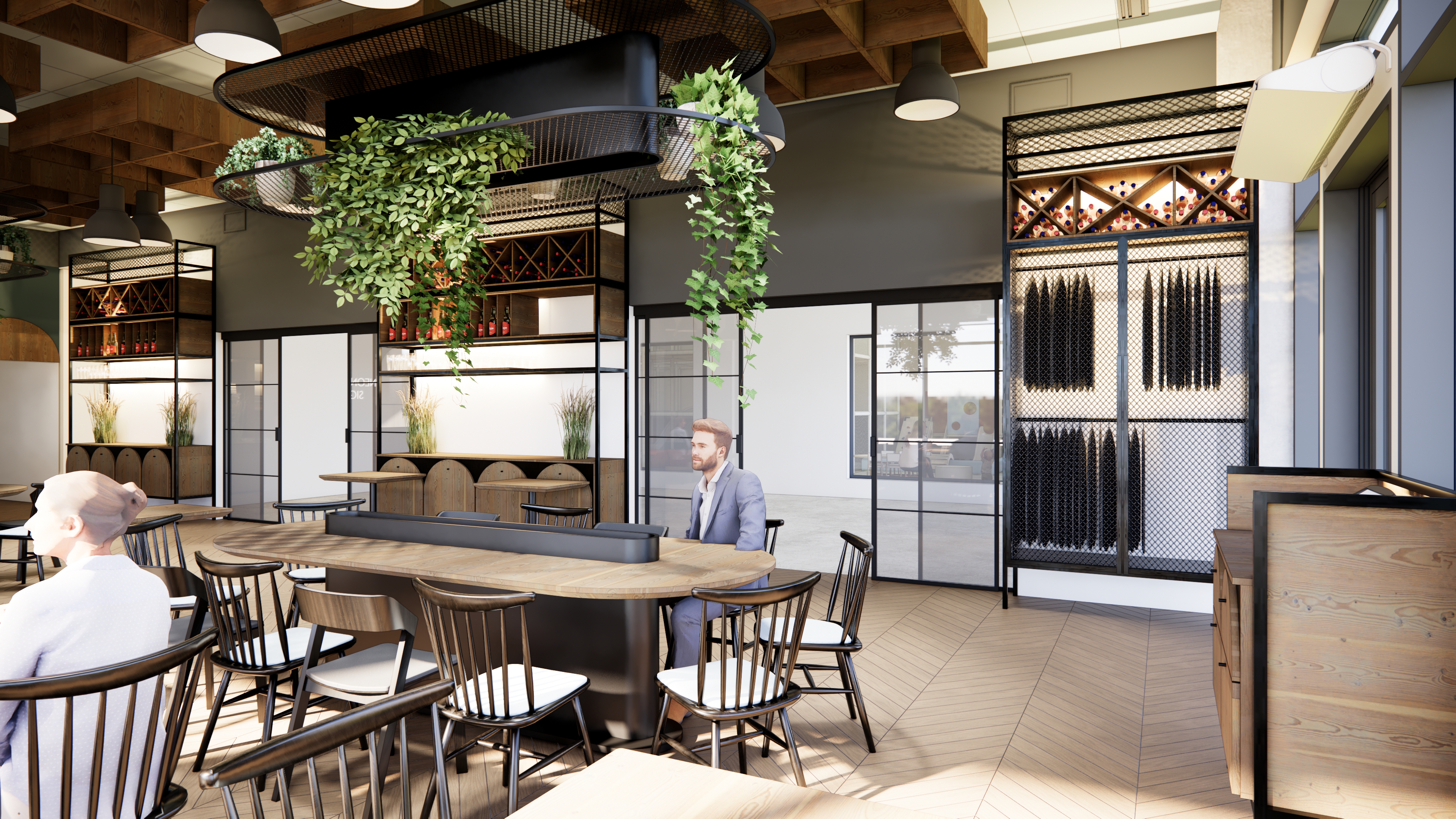 this is a fine restaurant interior refine image with realistic materials add people add tableware some plants realistic lighting add needed furniture in the back create a moody image