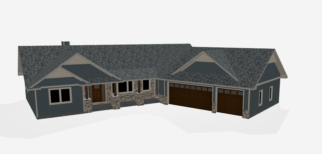 a beautifully rendered modern house with a gable roof featuring a soft gray stone texture exterior walls clad in elegant navy blue siding accented by subtle beige trim front entrance with a rich wooden door complementing the dark chocolate brown garage doors the house is set against a peaceful twilight sky casting a warm glow over the scene