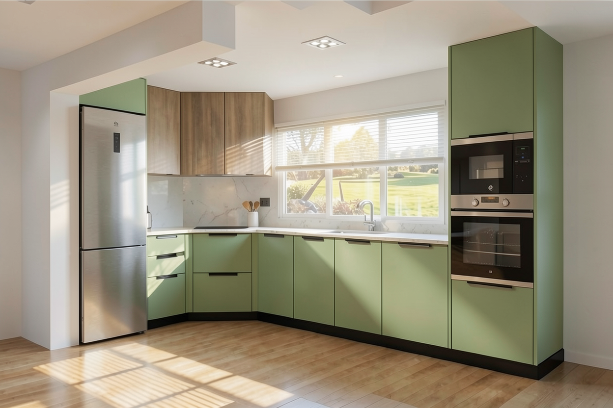 change the green color to a softer color keep the wooden furniture and leave the baseboard in black