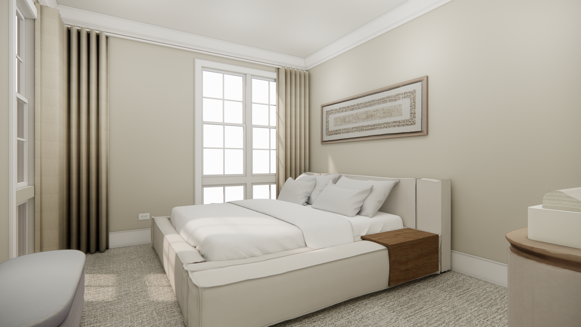 enhance this render to look more realistic improve lighting shadows reflections and material realism but do not add remove or alter any elements objects or materials keep everything exactly the same just make it more photorealistic keep it light and airy add trees outside the window