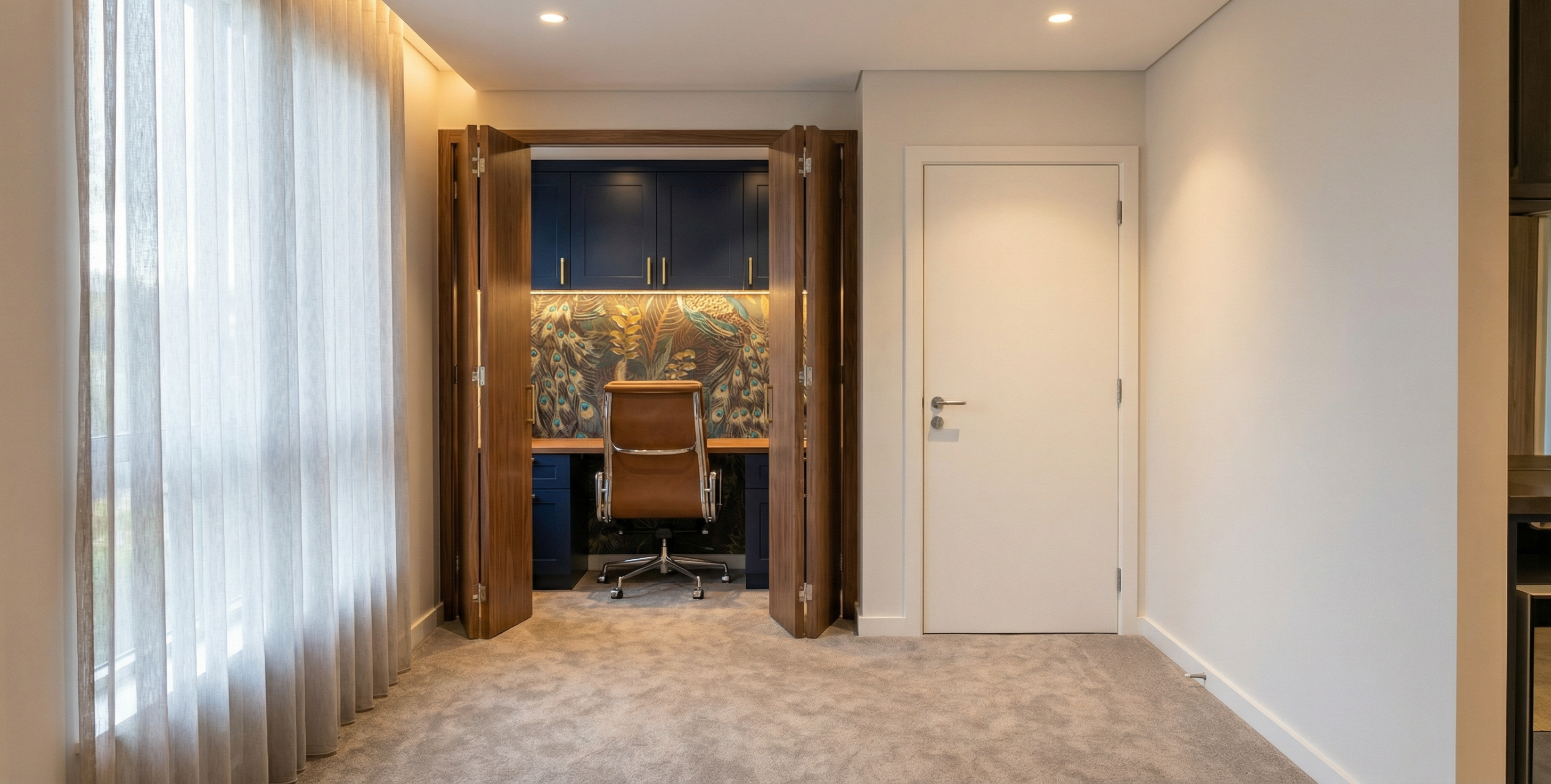 create a realistic render of this image for an interior design client add a simple ceiling add lighting sheer soft curtains soft grey beige carpet over the entire floor throughout remove the text make the bi fold office doors walnut add in lighting in the office