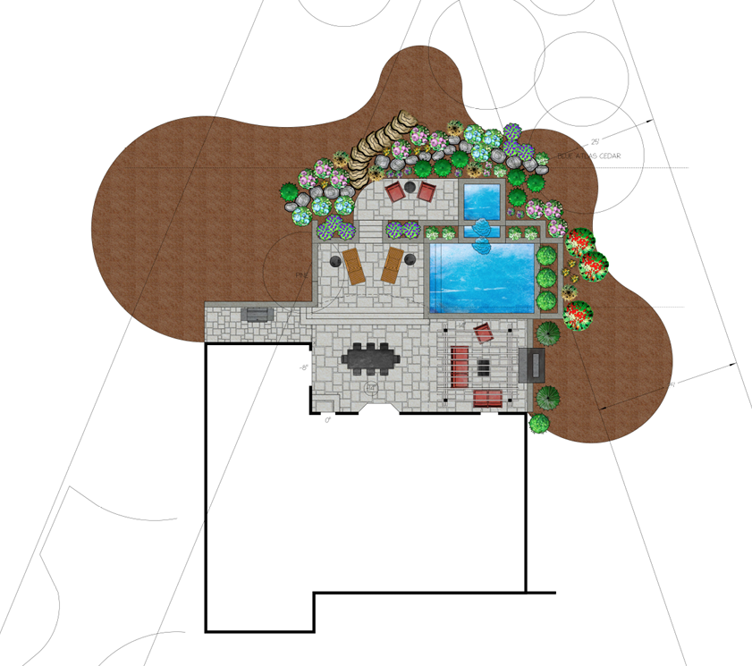 exterior shot a new backyard hardscape and planting design shown beautifully in the twighlight hours with wamr glow lighting accents