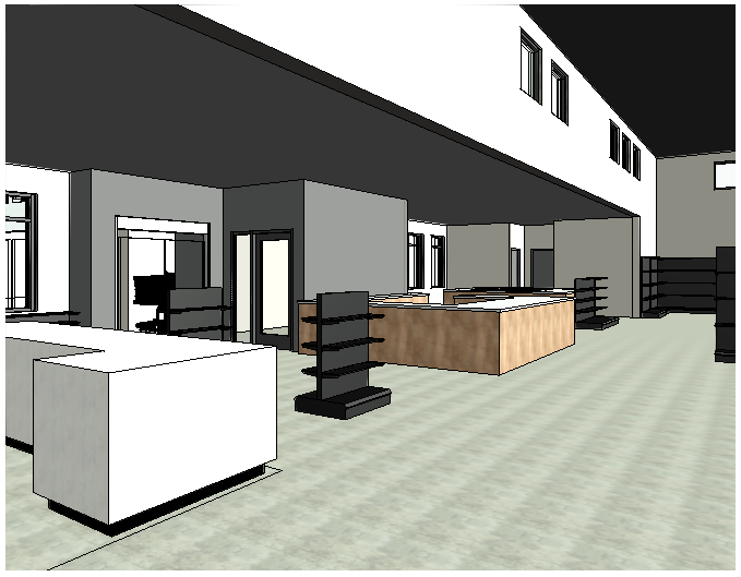 this is the entrance check out stations at a liquor store with sealed concrete floors exposed painted structure ceiling black shelving neon beer signs on wall people shopping do not add windows