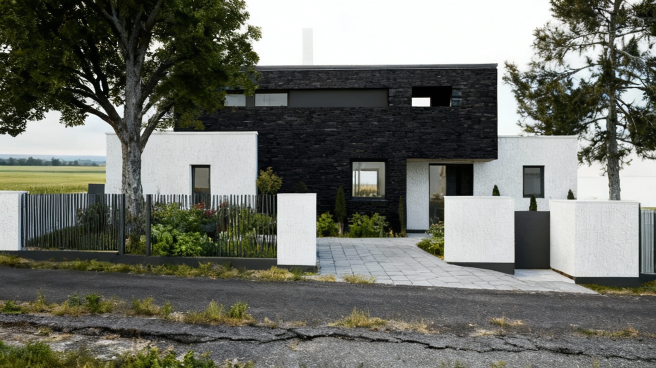 keep the lighting environment weather and time of day exactly as shown in the photo remove the fence and pillars and transform the entire front wall into a continuous hedge do not alter any other elements in the scene