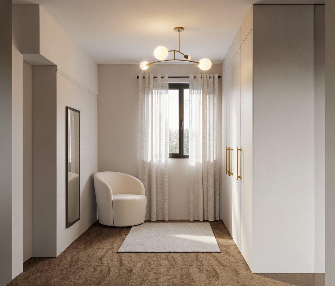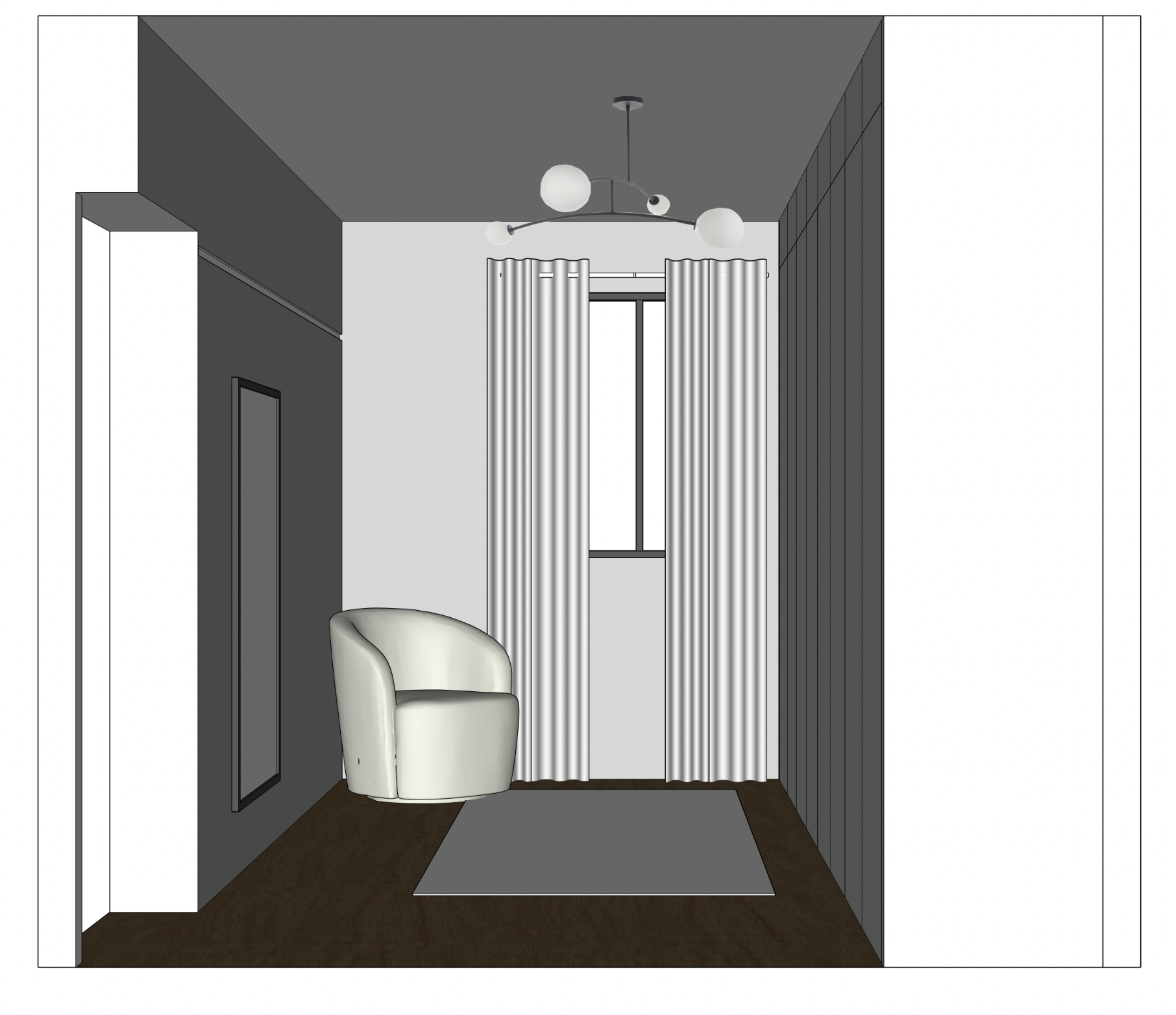 render my image make the walls and cabinets light grey add antique brass knobs to cabinet on right wall make the chair light grey and the rug mottled grey add a beige cushion to the chair add sheer linen texture to the curtains add light source to the ceiling light