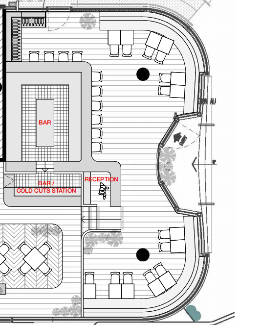 render the area exactly as shown in the provided floor plan restaurant entrance interior warm microcement floor mixed with antique parquet in small irregular pieces recycled stone powder slab walls real reclaimed antique brick accents hanging green plants integrated into ceiling soft warm lighting contemporary italian design with authentic historical elements mediterranean minimal style