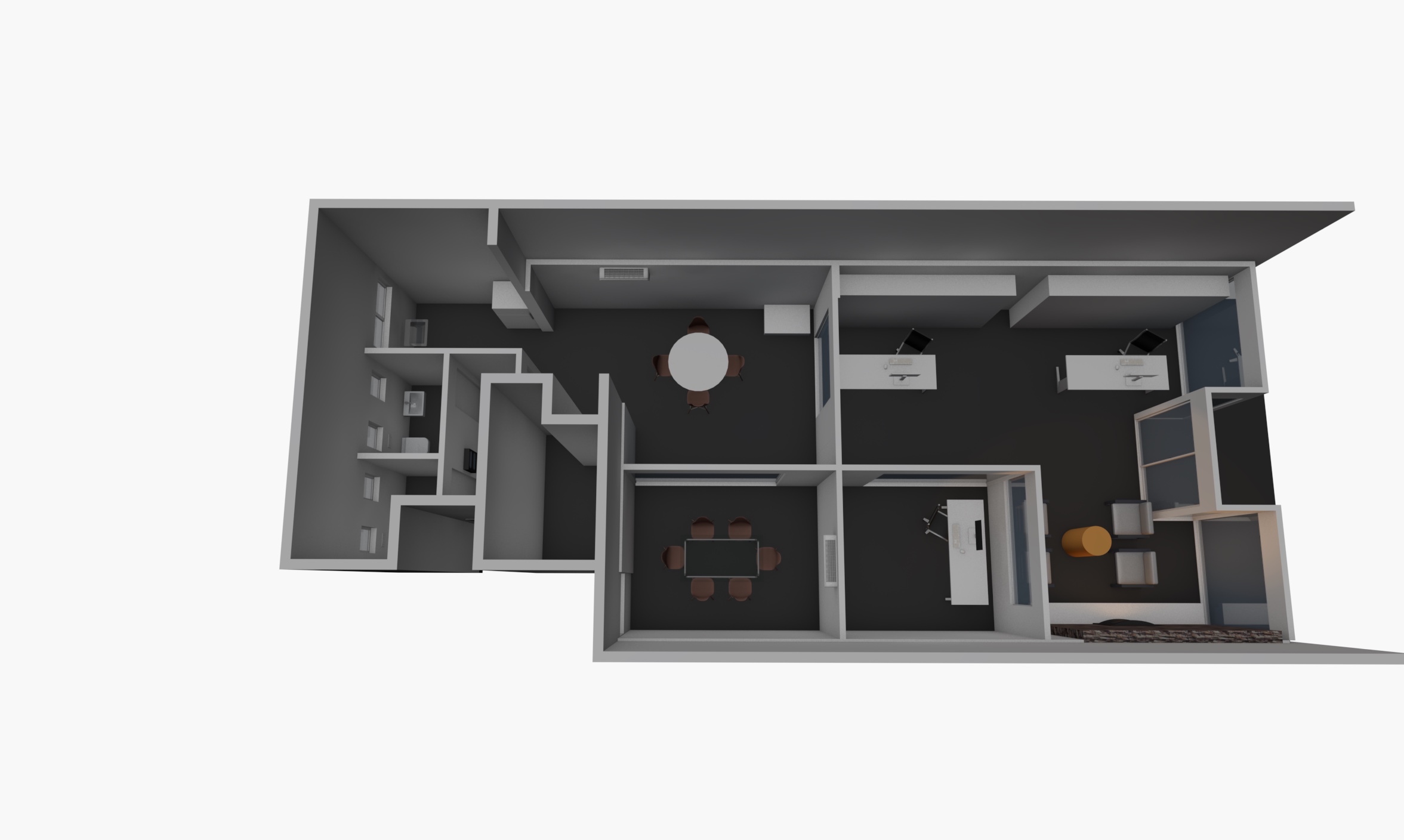 render this office from above add a small amount of wall lighting add a white background and some light timber flooring add small kitchen beside the fridge