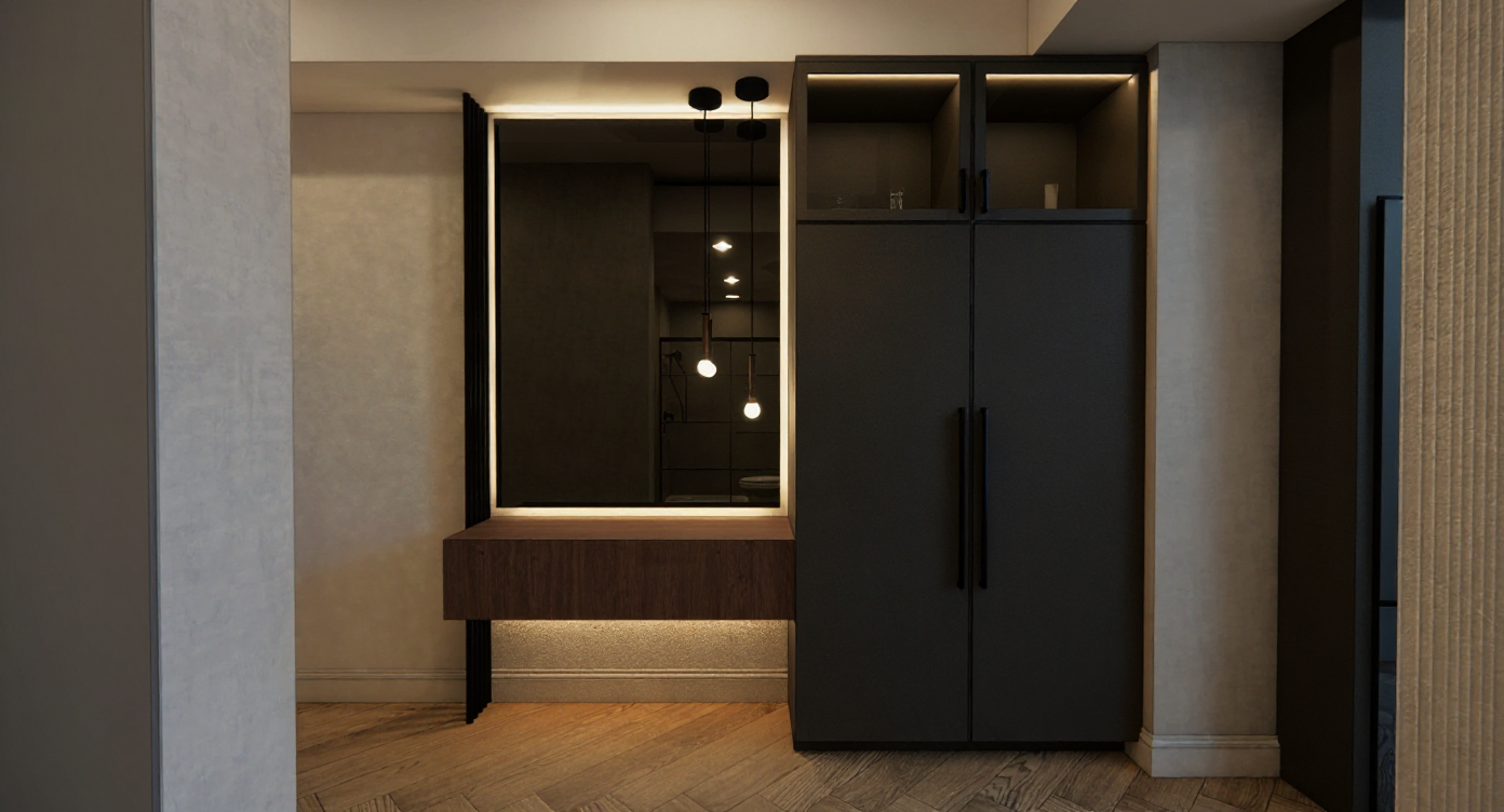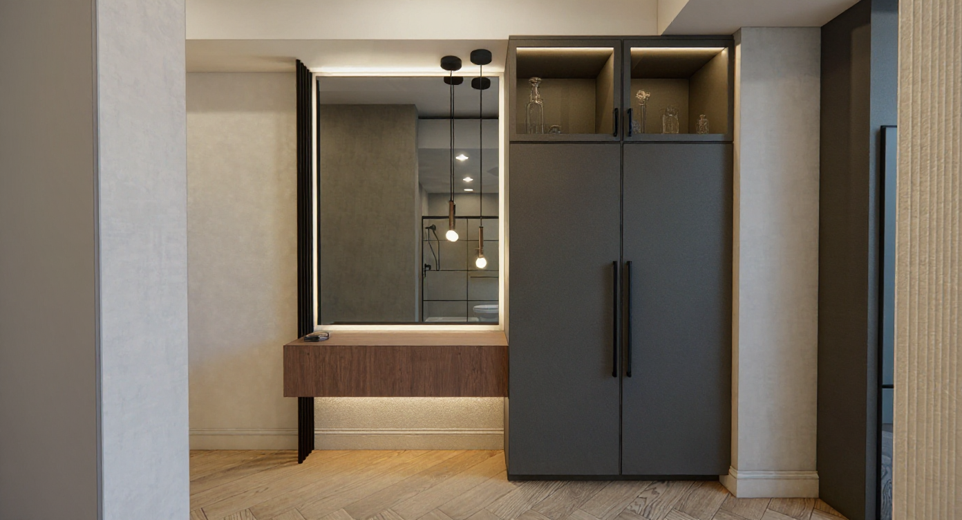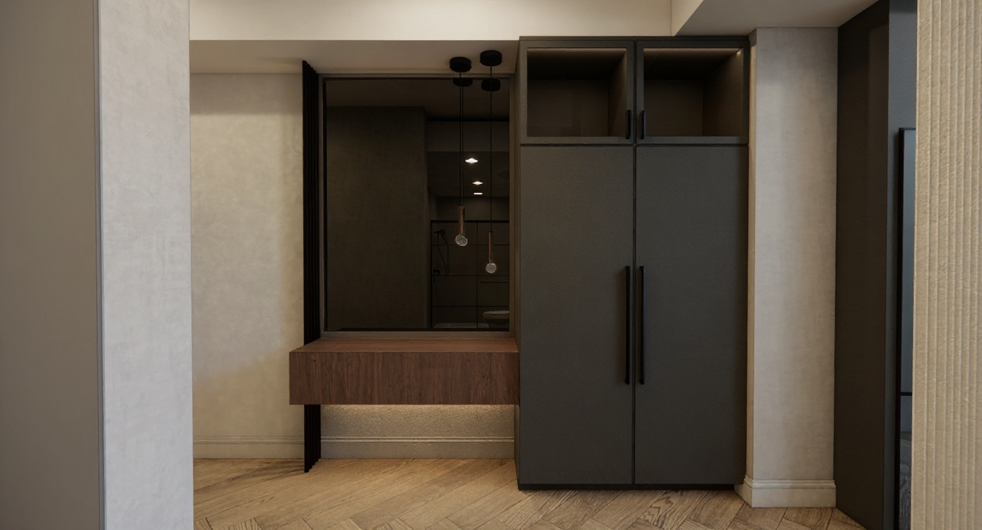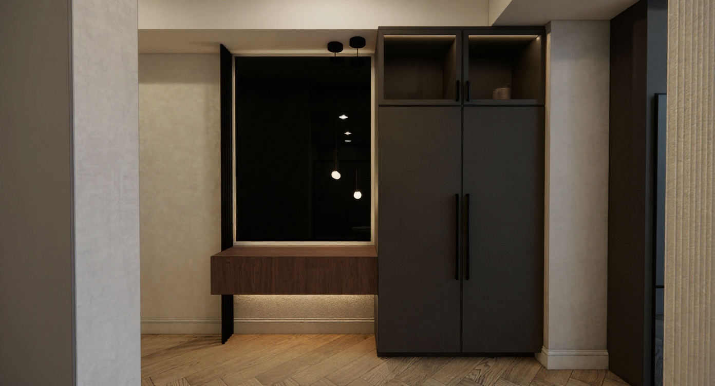 render a modern elegant waiting room with a calming atmosphere include a central seating area with dark brown tufted upholstery surrounded by lush green potted plants the walls should be a creamy white with two large abstract paintings in soft beige and white tones incorporate a warm wooden door on the left a light wood side table and sleek chairs with white cushions and dark frames the floor is a rich dark wood and the ceiling features a subtle gray grid pattern use warm ambient lighting to create a welcoming and serene environment