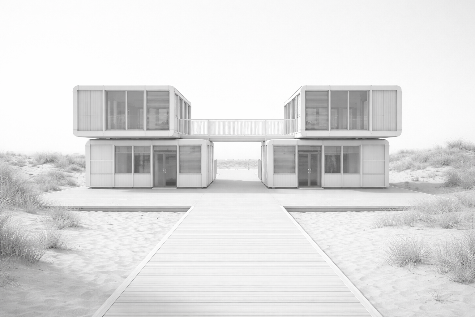 architectural beach entrance composition made of four modular containers based on the reference geometry each container has exact dimensions width 2 20 m length 5 80 m height 2 50 m the containers are arranged exactly as in the reference image with an upper cantilevered container placed on top of a ground container a second identical pair of containers is placed in mirrored position relative to the first pair all four containers are positioned on a square wooden deck platform with dimensions 11 60 m x 11 60 m together the two mirrored container pairs occupy and frame one half of this deck surface when viewed in plan leaving the other half as open accessible deck space a linear wooden deck promenade leads toward the entrance composition and is aligned longitudinally with the main deck platform not perpendicular to it the promenade connects seamlessly into the open half of the square deck exterior container finish brushed aluminium clean modern appearance subtle reflections interior container finish warm teak wood surfaces with visible natural grain on each container one glazed fa ade panel is replaced with vertical teak wooden slats evenly spaced creating filtered light and partial screening functional layout upper cantilevered containers function as beach administrative offices lower containers function as ticket booths for entrance and exit ground surface beyond the main deck sandy beach terrain with minimal vegetation the sea is not visible in the scene and is located in another direction camera pedestrian eye level architectural perspective framing tight and focused on the entrance structure and deck platform with limited background visibility lighting bright summer daylight clear shadows calm coastal atmosphere ultra realistic cinematic architectural visualization clean detailing human scale readable