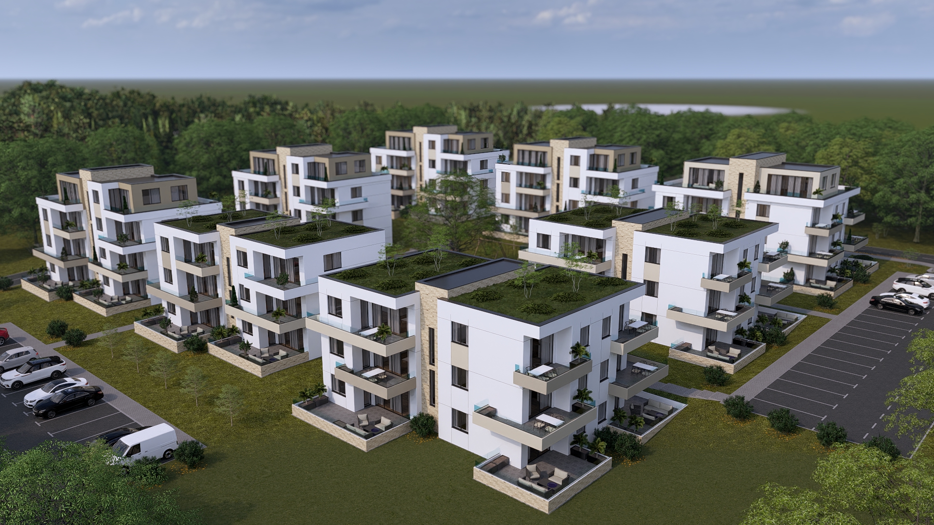 modernist exterior shot modern building with a white facade and beige balconies surrounded by greenery and flowers architecture