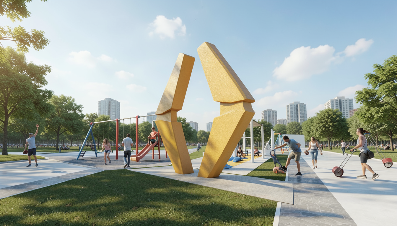 ultra realistic architectural playground render strictly preserve the exact playground equipment design do not modify shapes do not redesign structures do not alter layout maintain original proportions and materials enhance lighting realism and integrate realistic urban context in the background natural trees subtle distant buildings believable sky physically accurate daylight with consistent shadow direction environmental bounce light and natural shadow gradients naturally interacting with the equipment in realistic ways every playground element being actively used authentic body mechanics and weight distribution varied dynamic with background slightly softened professional architectural photography style balanced daylight high detail 8k clarity