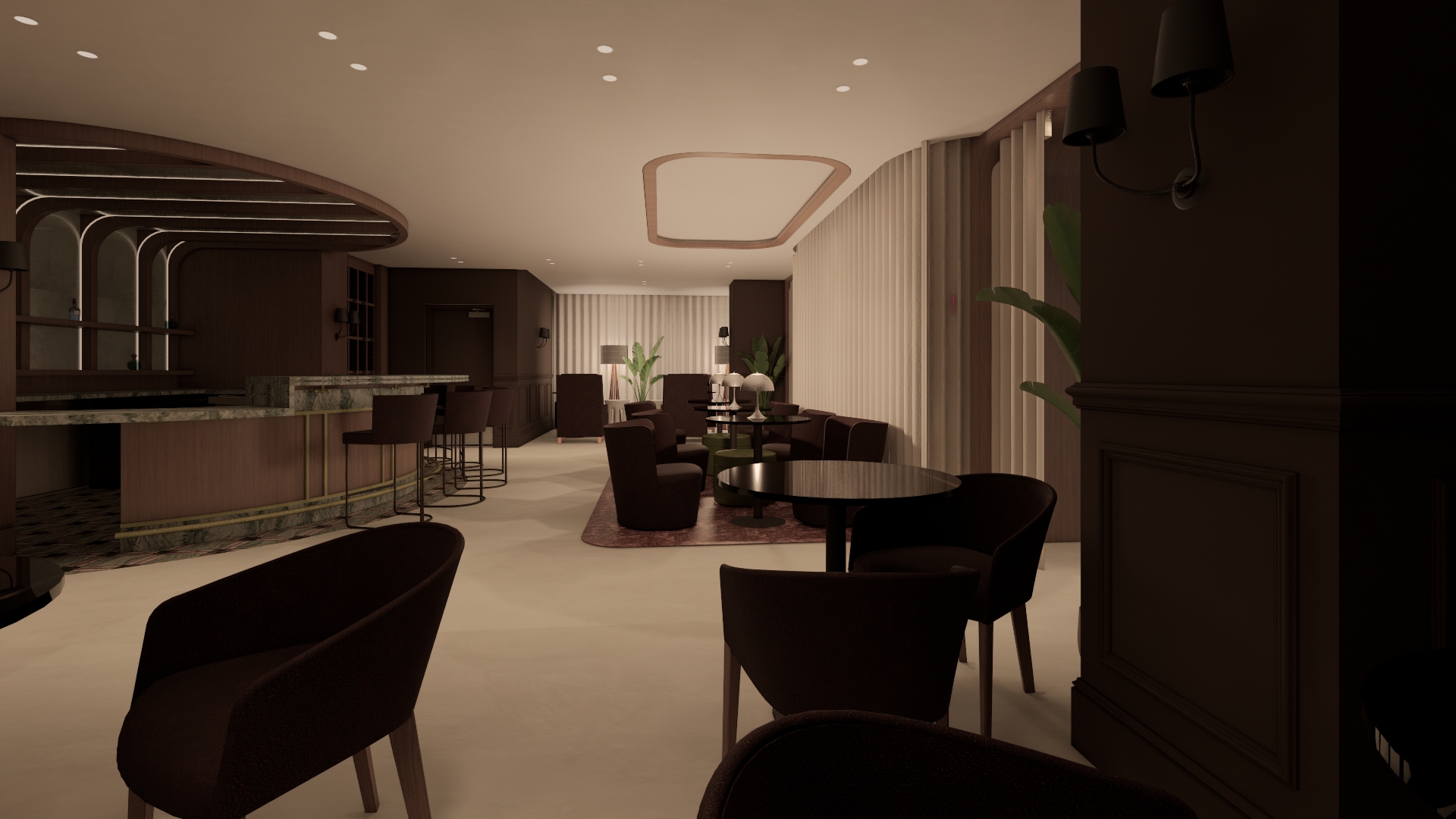 add one bartender behind the bar preparing drinks and interacting naturally while preserving the bar s structure and alignment stools should appear upholstered in brown leather with subtle natural sheen and cushioned tactile texture include guests seated at the bar add premium alcohol bottles arranged tastefully to bar shelves keep all materials as they are