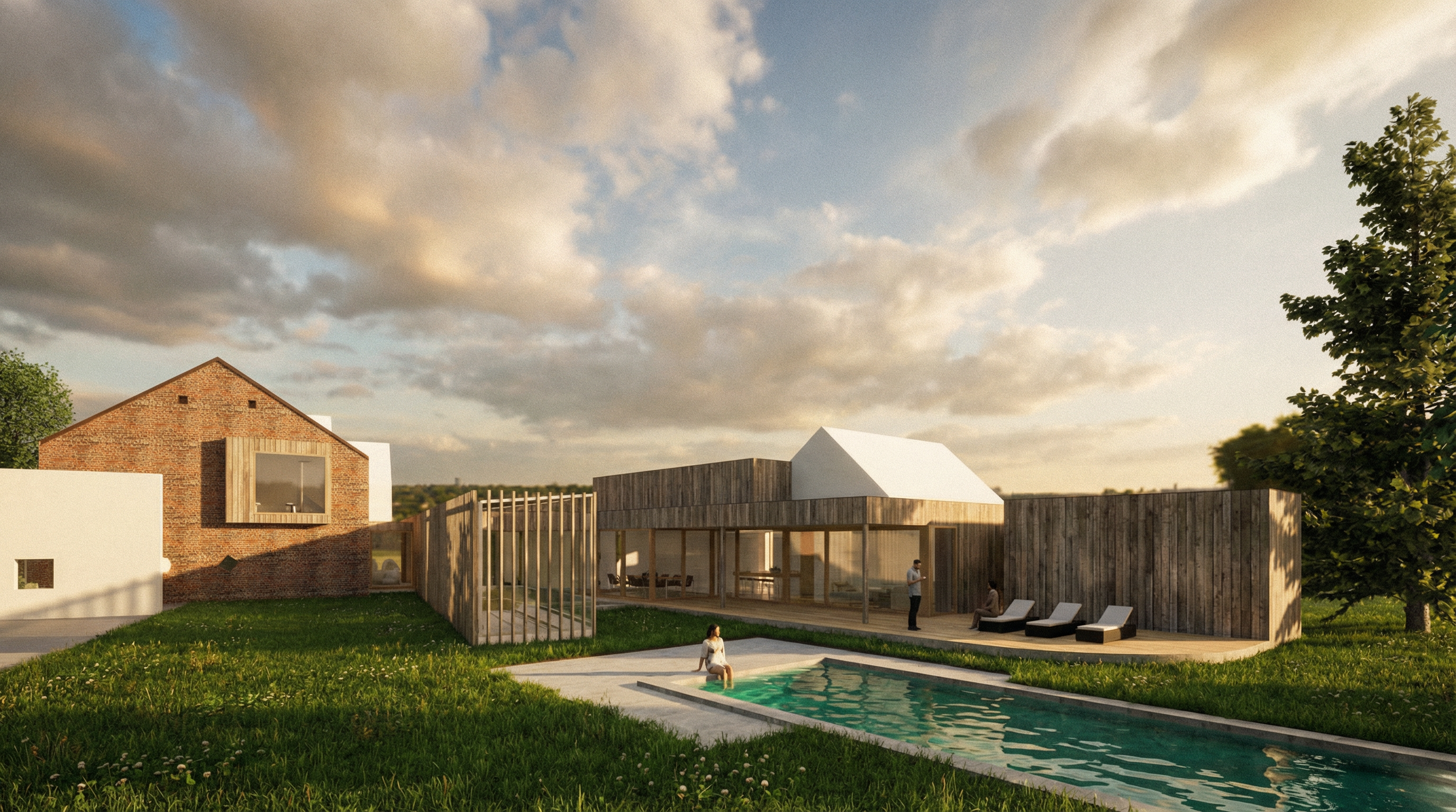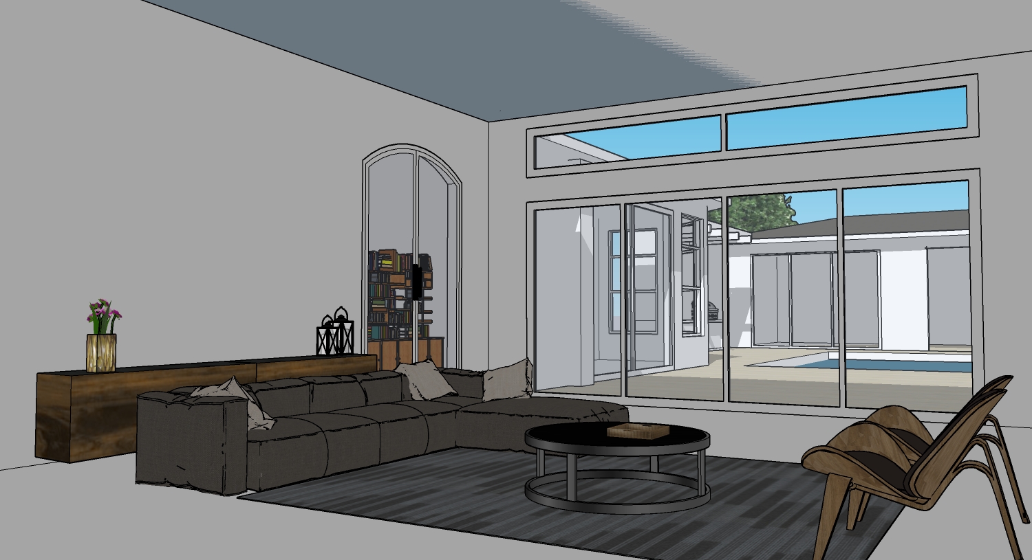 use the uploaded image as a base reference transform this interior living room into a highly realistic photorealistic architectural visualization maintain the existing layout furniture placement and proportions apply realistic materials and textures soft fabric upholstery for the sectional sofa natural wood grain for furniture subtle metal accents and a refined woven rug texture improve lighting with natural daylight streaming through the glass doors and windows soft global illumination realistic shadows and gentle reflections update all doors and windows to have clean modern white frames with realistic thickness and detailing glass should be clear with accurate reflections and transparency showing the outdoor courtyard and pool naturally walls should be smooth painted matte off white ceiling clean and minimal enhance depth contrast and realism while keeping a modern minimalist warm architectural style ultra high resolution realistic camera perspective professional interior photography look natural color grading no stylization no sketch lines