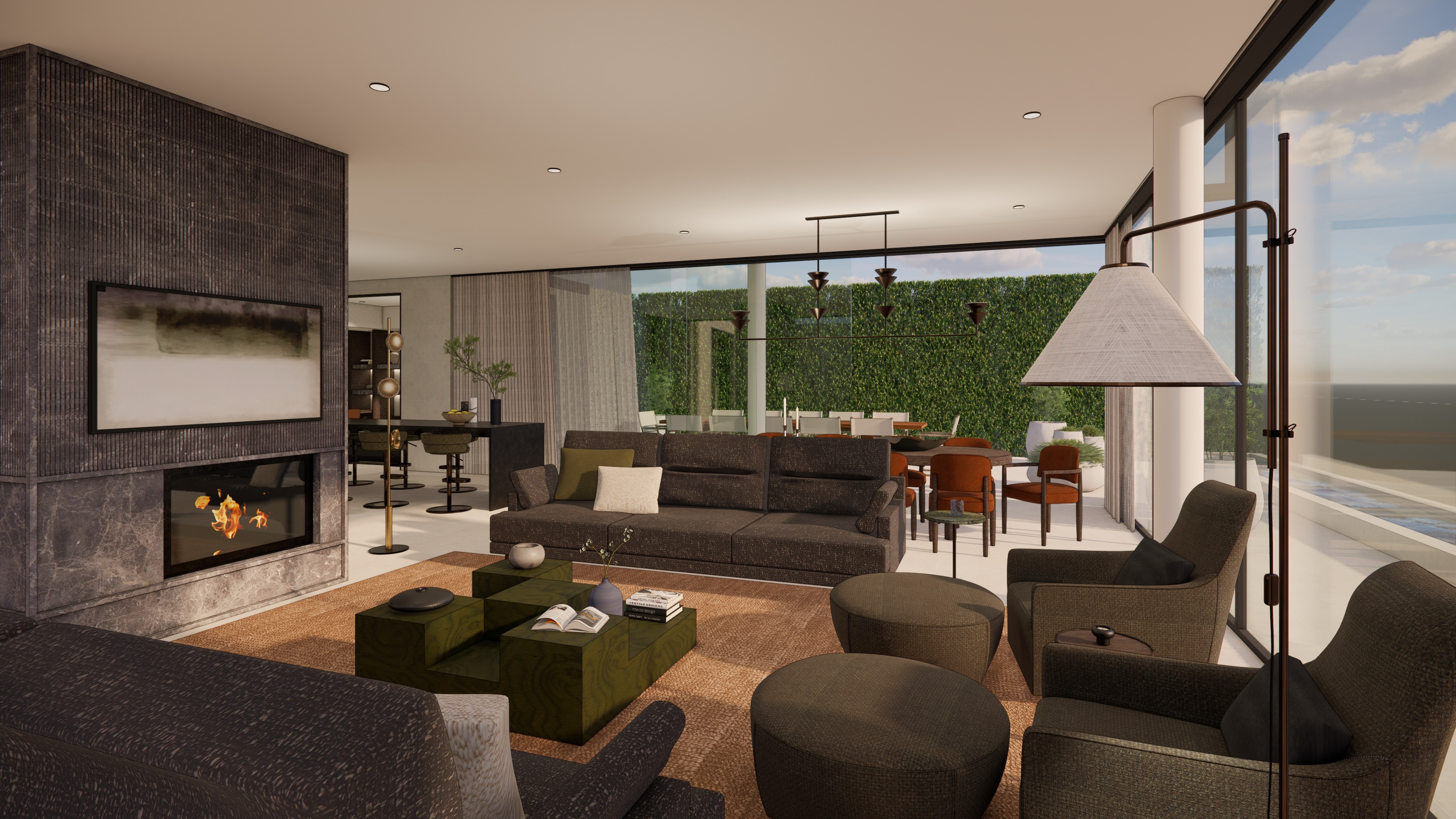 contemporary living room interior luxurious and inviting atmosphere use a palette with warm earth tones deep chocolate brown sofas and chairs olive green low table feature a dark marbled stone fireplace wall with a soft burning fire include large windows showcasing a green exterior new zealand foliage add a modern floor lamp with a beige shade and subtle lighting creating a cozy warm ambiance the room layout is open and spacious blending indoor and outdoor elements seamlessly