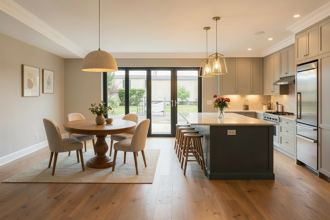 add one more pendant in the same style as the other two over the island keep the pendants in line over centreline of island