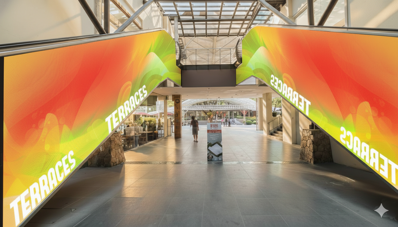 can you make this look realistic the colors on the escalator dont make it too strong make sure it vibes with everything anad the word terraces to be embedded on it make it cool