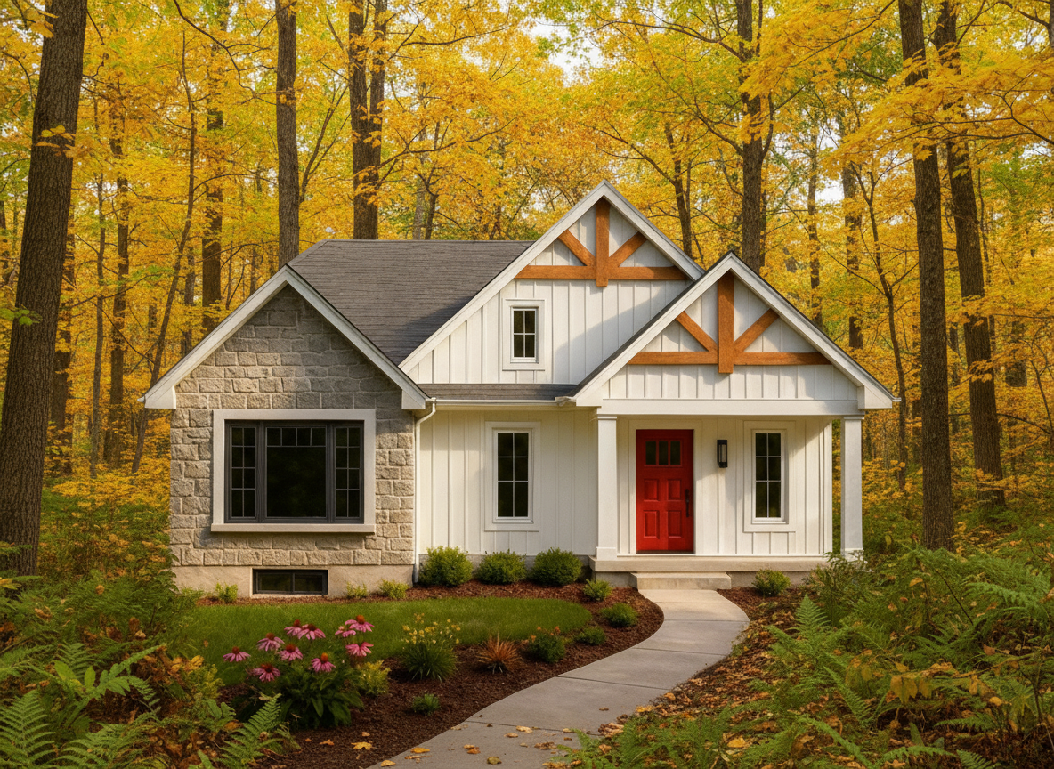 a charming cozy house nestled in a lush verdant forest the house exterior features a combination of light gray stone walls and white vertical siding adorned with warm wooden accents the roof is a subtle gray complementing the overall aesthetic the inviting front door is painted a vibrant red providing a striking contrast the pathway leading to the house is a soft natural gray bordered by well maintained grass and colorful flower beds with pink and yellow blooms the surrounding atmosphere is tranquil with towering green trees providing a serene backdrop on a sunny day