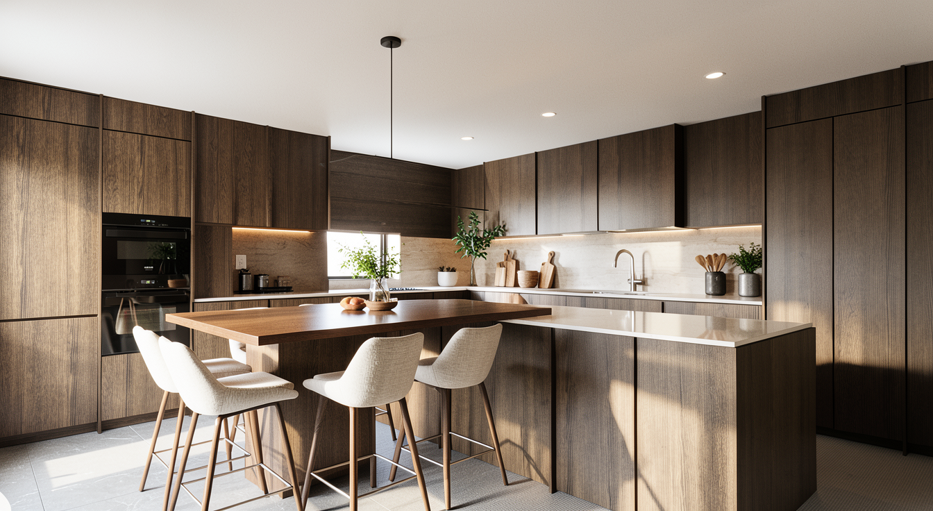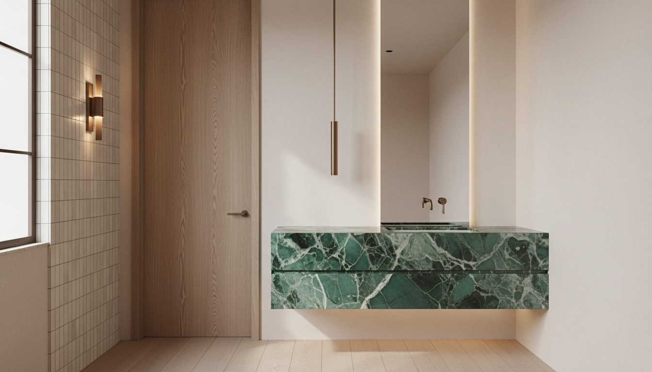 a high end architectural digest style interior photograph of a luxury powder room with a quiet luxury aesthetic shot on a 24 28mm full frame lens at eye level with subtle asymmetrical composition realistic architectural framing and natural spatial depth the scene is lit using a physically accurate 4 layer architectural lighting system designed for high end editorial interior photography 1 key light primary illumination the primary light source is soft diffused natural daylight from an unseen large window or skylight off frame this daylight is bright neutral warm approximately 4000k and evenly fills the space without flattening it it establishes overall visibility and ensures all materials are readable while preserving depth the daylight is softened through architectural diffusion creating gentle shadow transitions and natural falloff not harsh directional shadows 2 fill light global bounce control secondary illumination comes from natural bounce light off the portola roman clay walls and white oak flooring this creates a soft warm ambient lift in shadow areas without flattening contrast a subtle invisible ceiling bounce ambient layer very low intensity ensures no crushed blacks while preserving dimensional separation between surfaces this fill light is not direct or visible it exists only as reflected illumination 3 accent light sculptural emphasis a warm 2700k wall sconce on the left bianco antico tile wall acts as a controlled accent light it produces a soft directional glow that grazes the textured tile surface enhancing depth and material relief the sconce does not overpower daylight it creates localized warmth shadow variation and visual hierarchy on the left side of the composition 4 architectural base light subtle integration a hidden under vanity led wash 2700 3000k extremely soft intensity creates a floating effect beneath the green oasis marble vanity this light gently illuminates the floor plane and adds spatial separation between vanity and flooring it is low intensity and fully diffused visible only as a soft glow not a light source material space response to light the green oasis marble vanity responds with soft controlled specular highlights and full veining visibility light grazes the stone naturally from multiple directions preventing flatness or overexposure the borderless vertical mirror reflects a balanced mix of daylight and soft shadow gradients it remains realistic with no blown highlights or overly dark reflections the arto bianco antico vertical tile wall shows strong texture definition under grazing sconce light with daylight maintaining overall readability the aged bronze ceiling mounted faucet and wall control knob catch subtle edge highlights from multiple light sources without disappearing into shadow the portola roman clay walls brooks softly diffuse daylight and bounce warm ambient light across the room preventing harsh transitions the wide plank white oak flooring remains evenly visible with soft natural shadowing and minimal reflection acting as a grounding surface the interior door is finished in matching white oak veneer aligned with the flooring species and tone for full material continuity matte finish subtle grain and minimal brushed bronze hardware integrate it into the architecture lighting result critical behavior rules lighting must read as bright architectural digest editorial daytime interior multi source layered illumination not single light moody soft but present contrast no flatness no darkness visible depth in corners without crushed blacks natural shadow hierarchy key bounce accent fill interaction do not produce flat evenly lit showroom lighting over dark cinematic shadows single source lighting look overexposed hdr washout cgi perfect uniform brightness render quality ultra realistic v ray corona renderer quality physically based rendering with global illumination ray traced reflections and realistic light decay high end architectural digest editorial photography aesthetic 8k resolution subtle imperfections in plaster marble veining variation and reflection behavior for realism