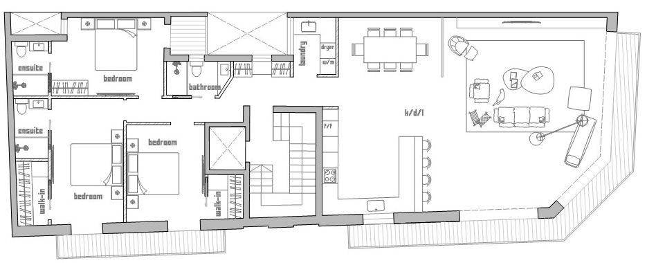 big bjarke ingels group interior from the top image is of a furniture plan generate an isometric view of it and make it such that the design is contemporary and cosy with timber floors for the bedrooms and tiles for the k d l please note carpets and soft furnishings architecture