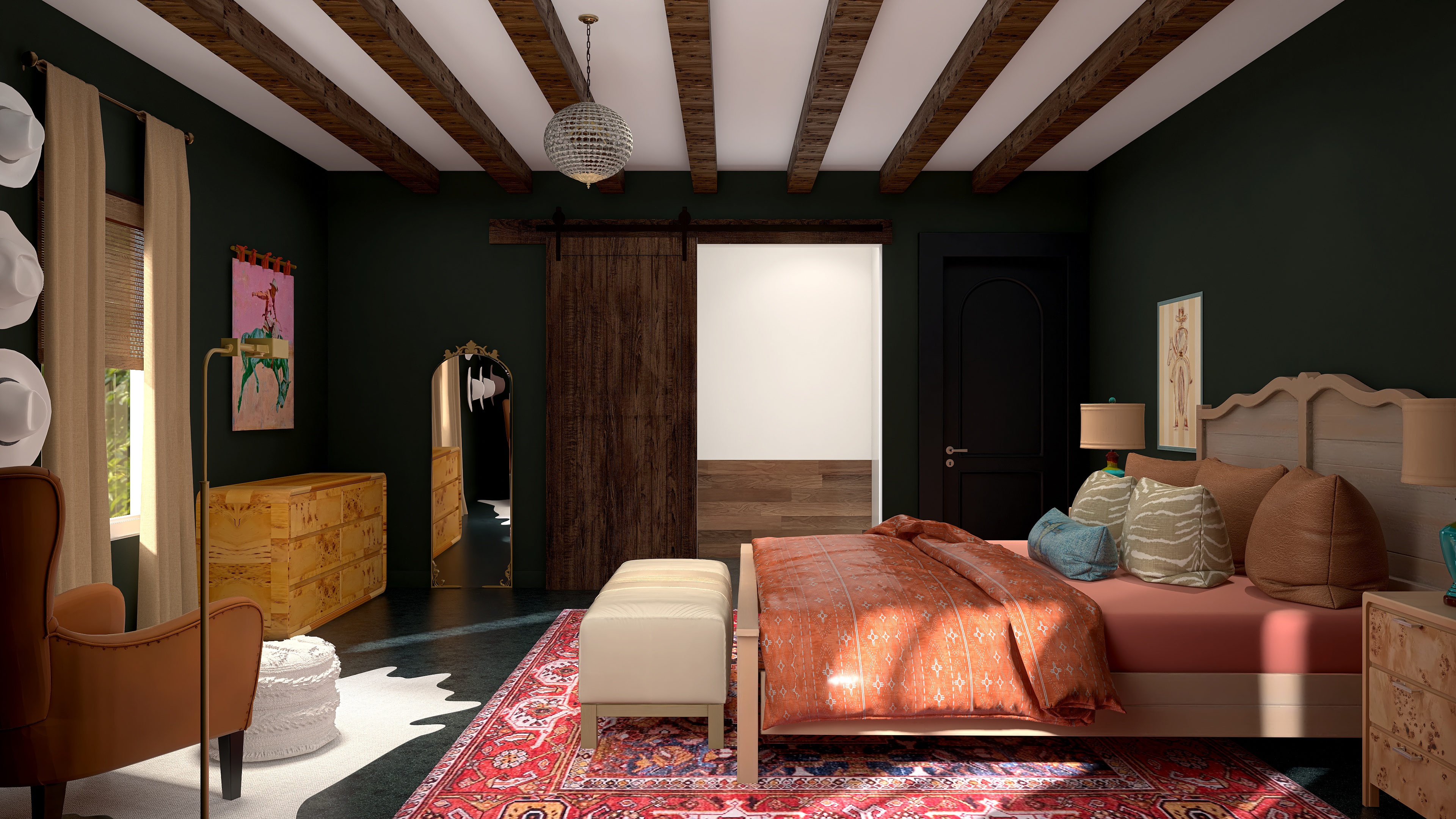 change the curtains to look more like these curtains the chair in the front should look more like the chair i added in the second photo the bench infront of the bed should look like this but from a side angle