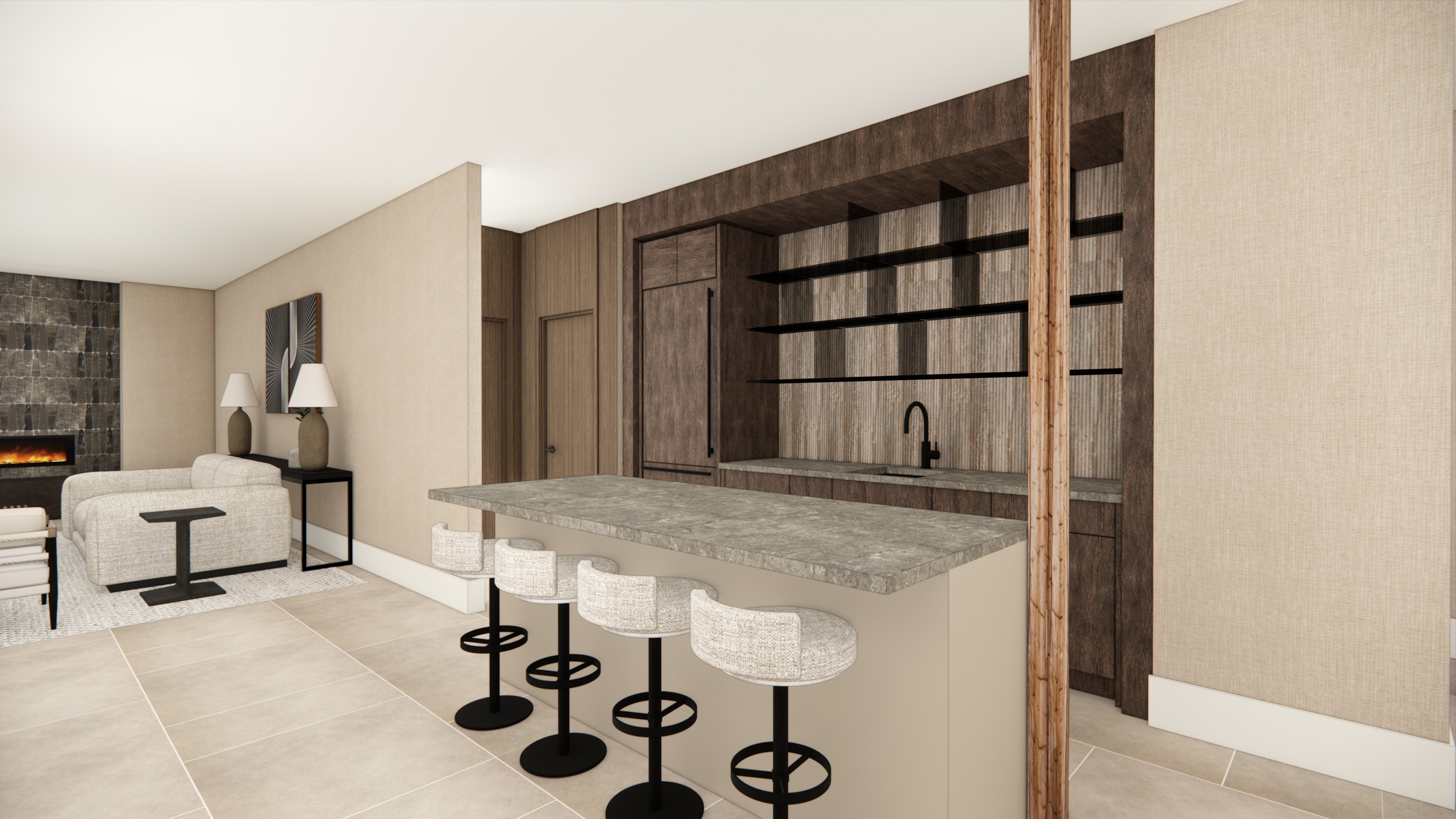 ultra photorealistic interior photograph of a modern mountain cabin bar and lounge area maintain the exact architecture and layout from the original render a stone fireplace lounge on the left with a curved cream sofa and table lamps and a contemporary bar on the right with a light stone waterfall countertop four upholstered bar stools with black bases dark walnut bar cabinetry open black metal shelves and a ribbed textured backsplash behind a matte black faucet and sink the space features warm neutral tones plaster walls vertical wood paneling and exposed natural wood columns materials should appear highly realistic honed limestone flooring with subtle variation brushed stone bar counter textured woven wall panels rich walnut wood grain matte black metal shelving and soft boucle upholstery on the bar stools lighting should feel natural and cinematic soft daylight entering from off camera windows warm ambient lighting from table lamps subtle fireplace glow realistic shadows soft reflections on the stone surfaces and global illumination shot as professional interior architecture photography with a full frame camera 24mm lens shallow but natural depth of field extremely high dynamic range crisp focus subtle lens imperfections and natural exposure style similar to high end architectural photography seen in architectural digest dezeen and luxury mountain homes in jackson hole or aspen ultra detailed photorealistic materials ray traced lighting global illumination cinematic composition natural color grading realistic textures professional interior photography