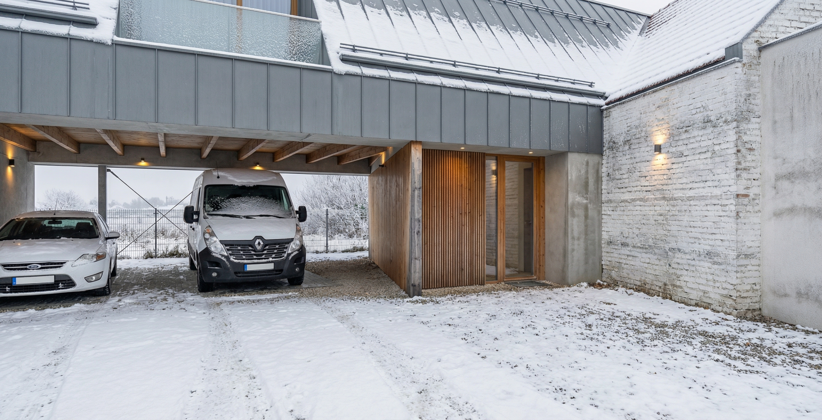 new building in a residential california neighbourgh with plants we re is white foreground is grass with plants polished concrete build is beige warm tones at gonden hour with soft shadows