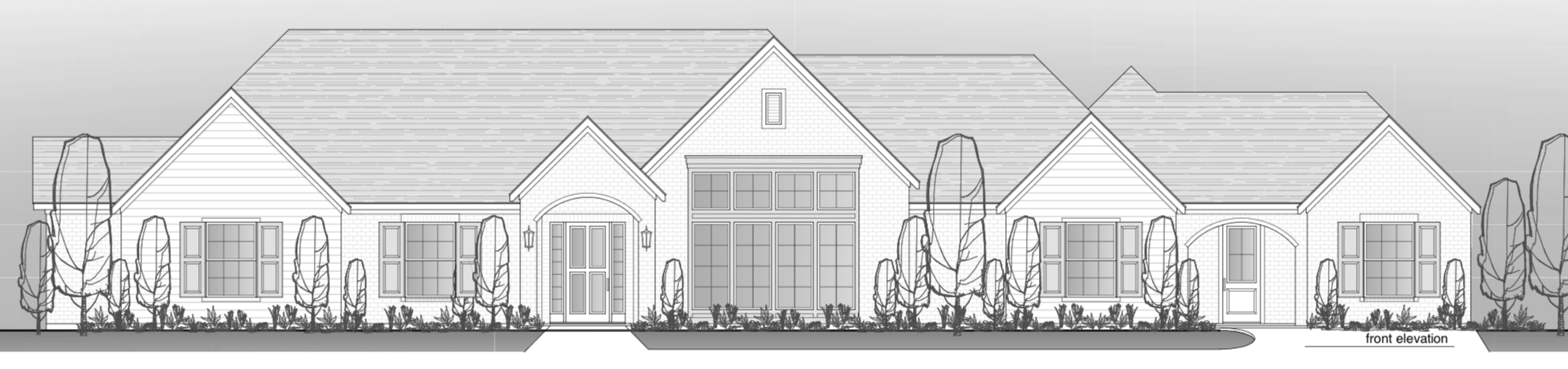 tudor revival exterior shot creamy white brick and siding beige roof creamy windows sea foam green front door in a forest architecture
