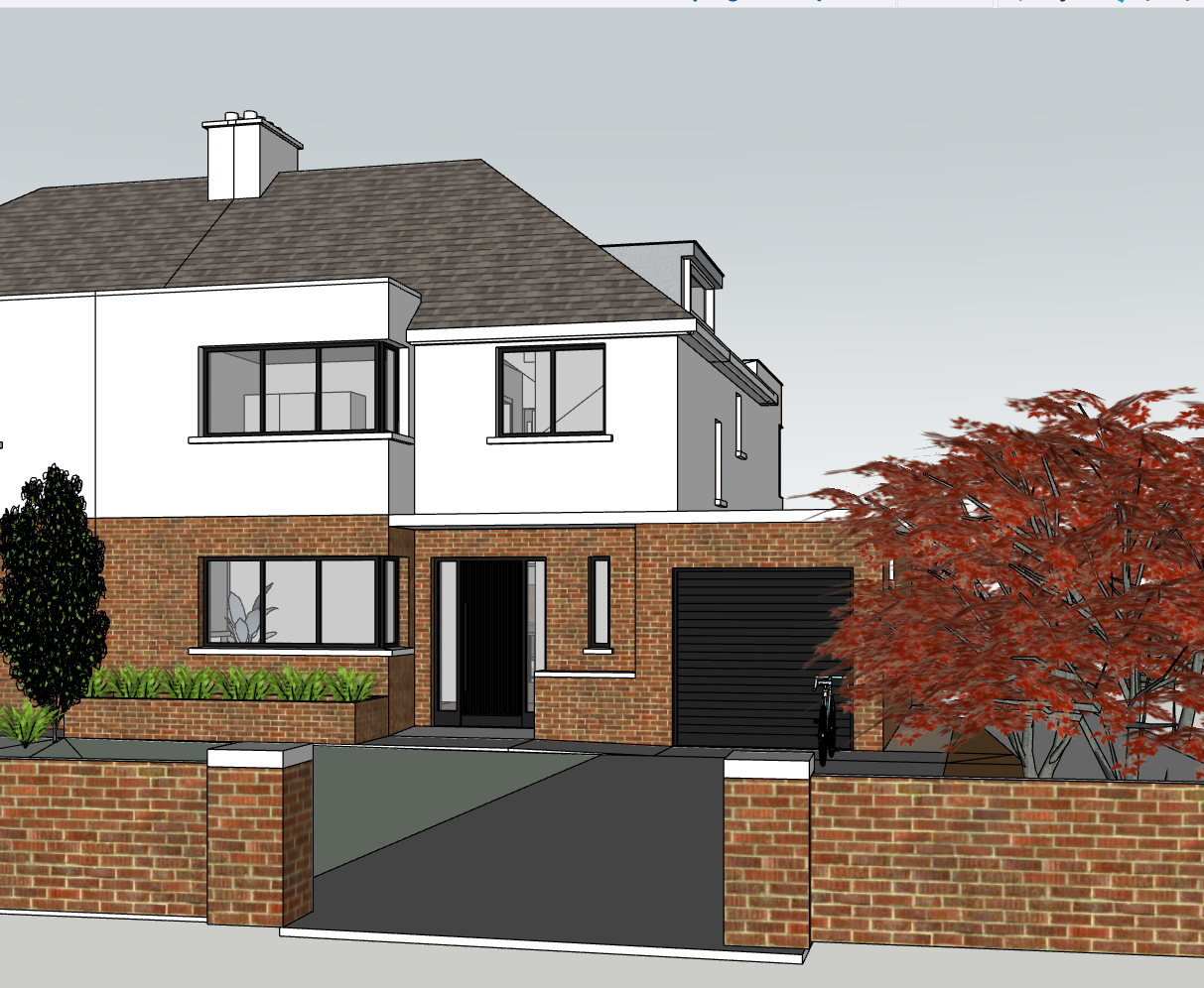 modernist exterior shot render a beautiful modern suburban house with a white and brick exterior the house has a clean minimalist design with sharp lines and large framed windows the roof is gray with a texture resembling natural slate the red brown brickwork contrasts elegantly against the white walls a manicured green lawn and diverse shrubbery line the perimeter a striking red maple tree stands prominently to the right its leaves vivid against the sky the driveway and pathway are smooth and dark enhancing the home s modern appeal the atmosphere is serene and inviting capturing a crisp clear day with soft natural lighting architecture