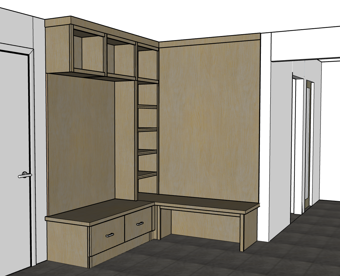 make this model look like a realistic mudroom with towels and hooks