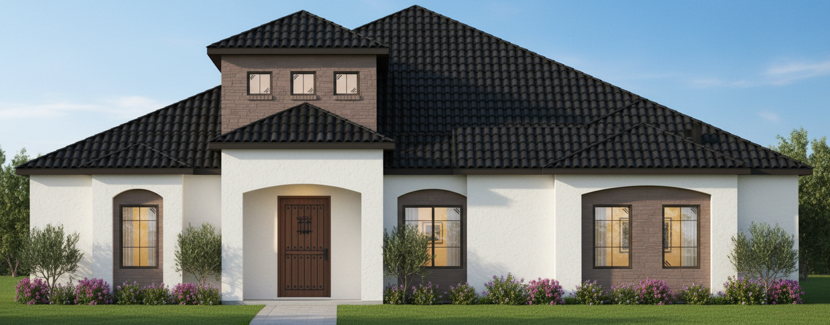 generate realistic beautiful elevation render with light inside with white stucco on front walls and black tile roof moderm culture stone