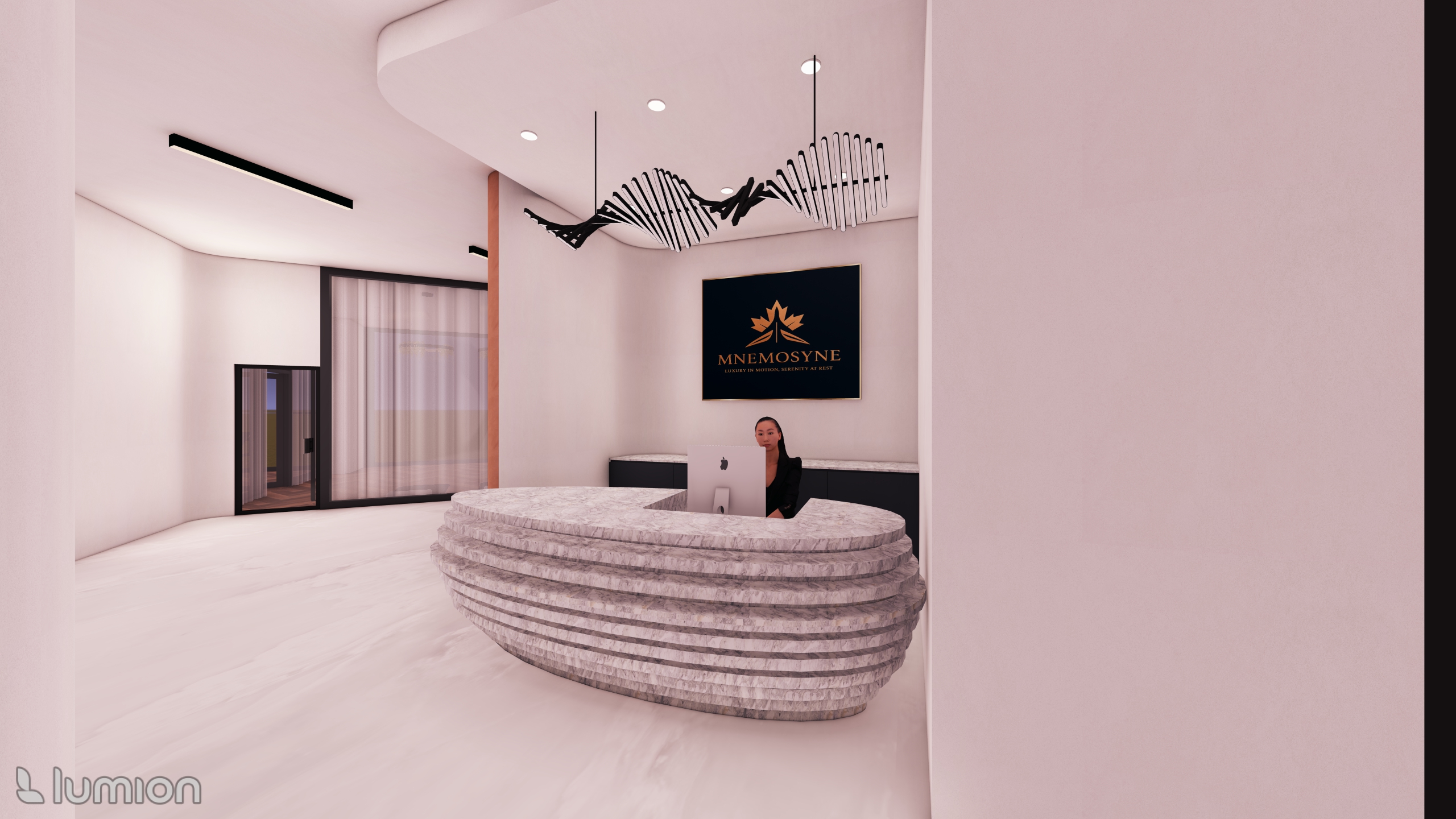 a soft elegant luxury reception lobby featuring a sculptural stone reception desk made of layered carved stone with an organic oval form behind the desk sits a receptionist in a minimal black outfit at an imac the interior has smooth warm toned plaster walls in pale blush paired with a seamless light marble floor a large black framed brand sign reading mnemosyne luxury in motion serenity at rest is mounted on the wall above the desk two sculptural pendant lights with twisting rib like black and white elements create a dynamic focal point the space is softly illuminated with recessed ceiling lights and slim modern light bars a floor to ceiling glass partition with sheer curtains sits to the left framed in black steel the overall atmosphere is modern serene and high end with a clean aesthetic soft shadows and realistic lumion style rendering